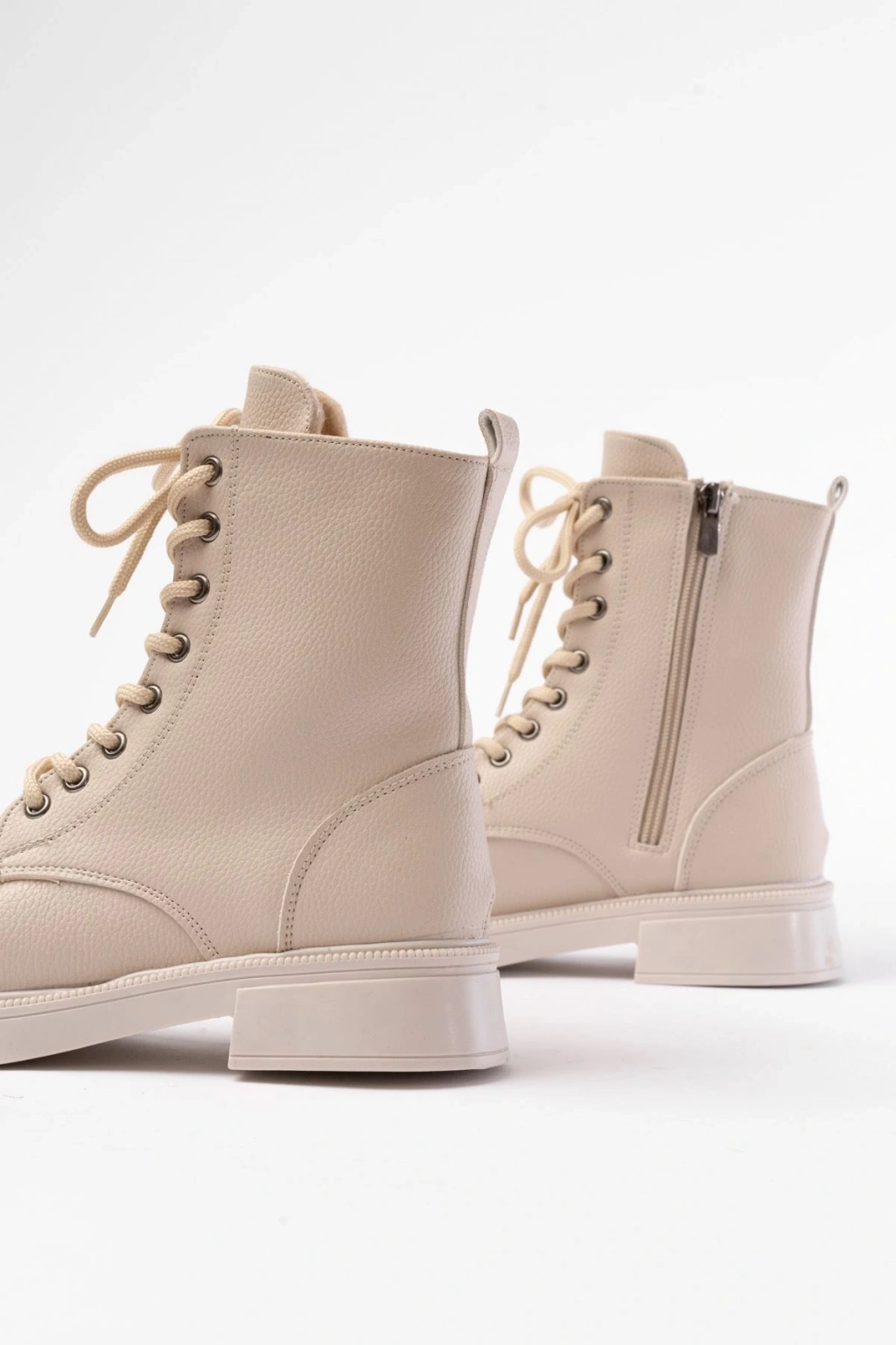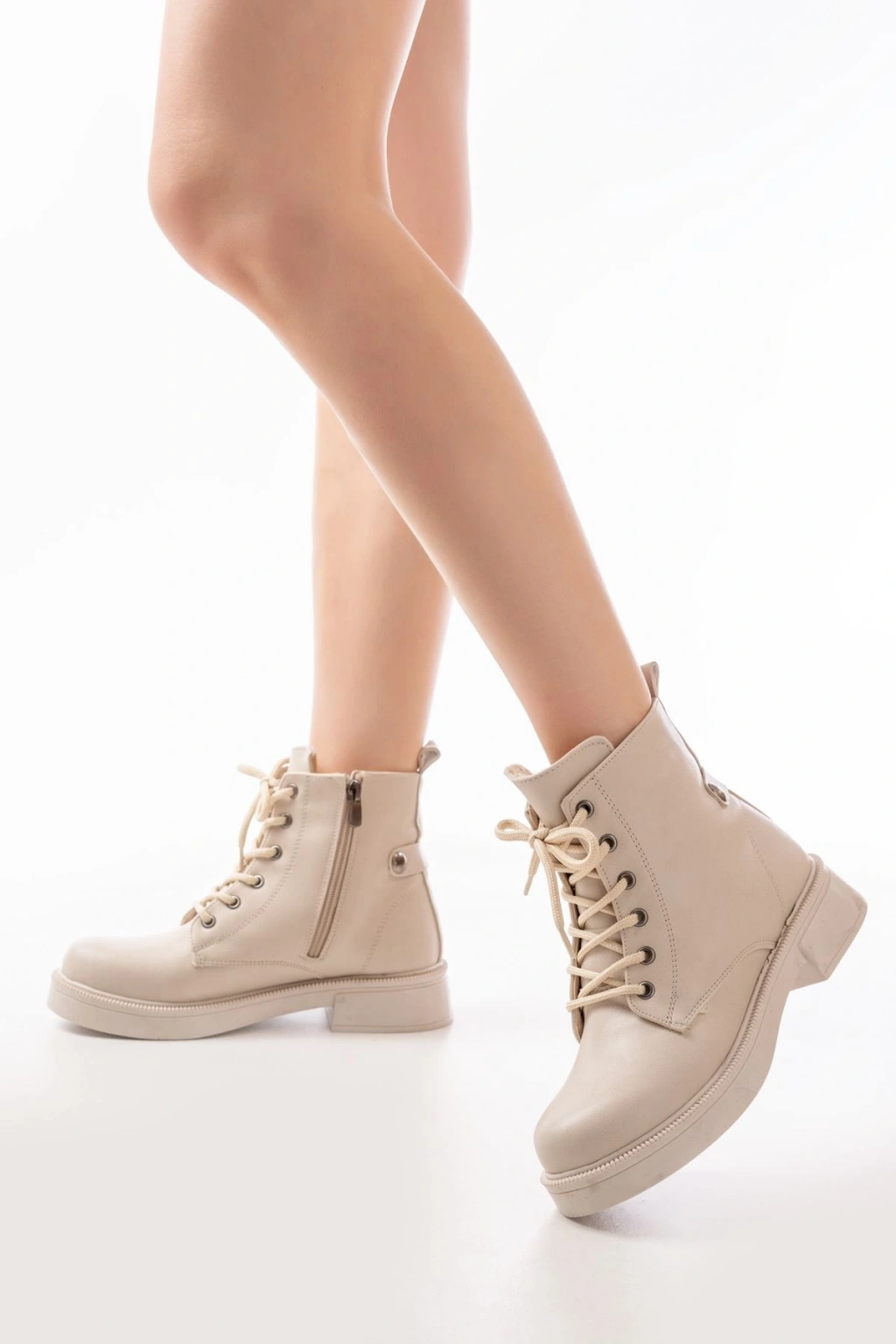 02-356 Bej Galata Düz Topuklu Bağcıklı Fermuarlı Günlük Kadın Bot