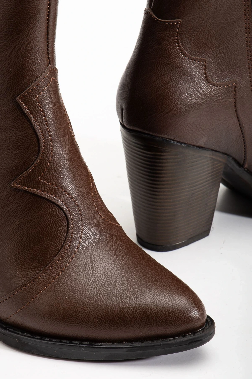 117 Kahve Kovboy Dikiş Detaylı Fermuarlı Yüksek Topuklu Günlük Kadın Bot