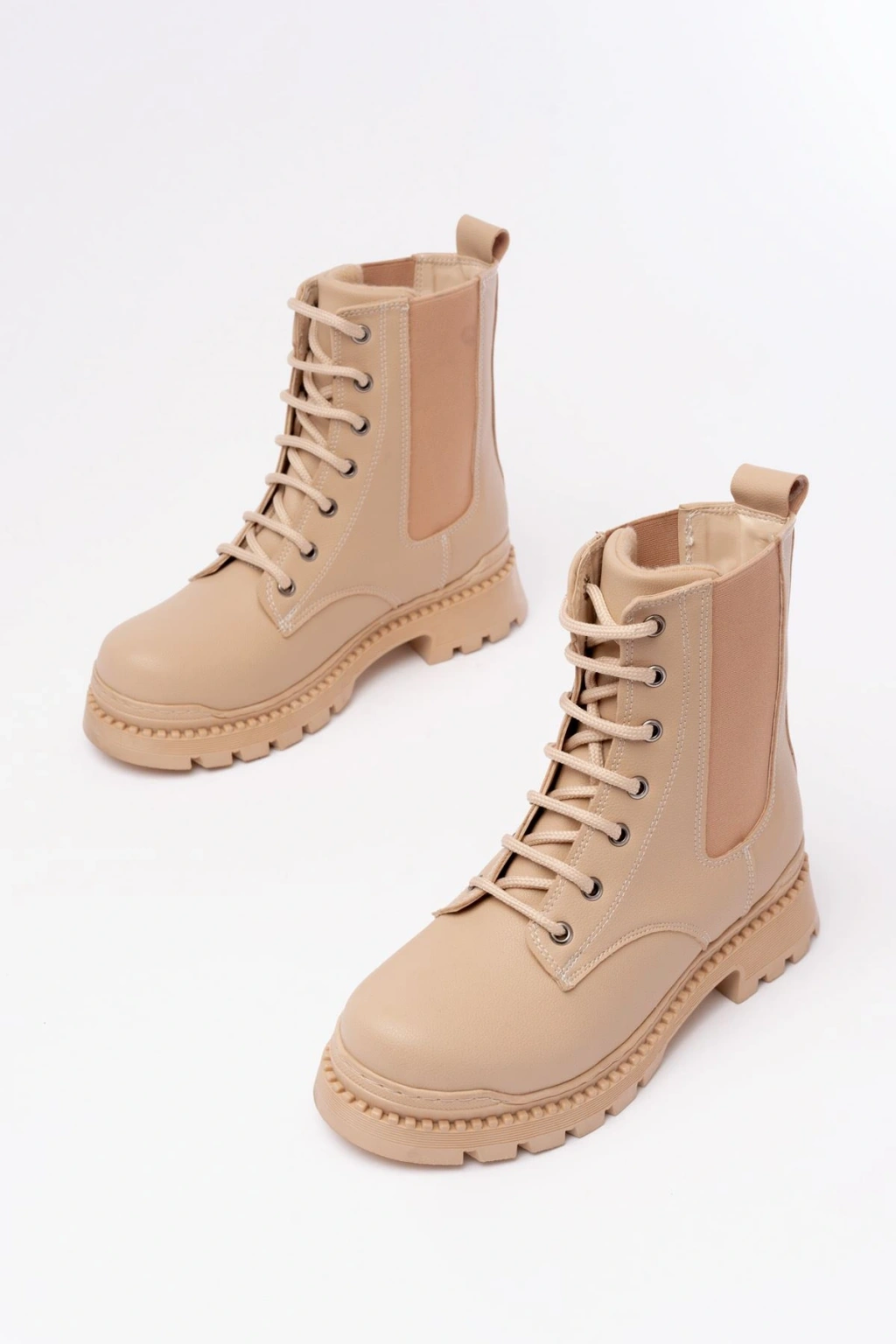 2051-298 Bej Düz Topuklu Bağcıklı Lastikli Günlük Kadın Bot