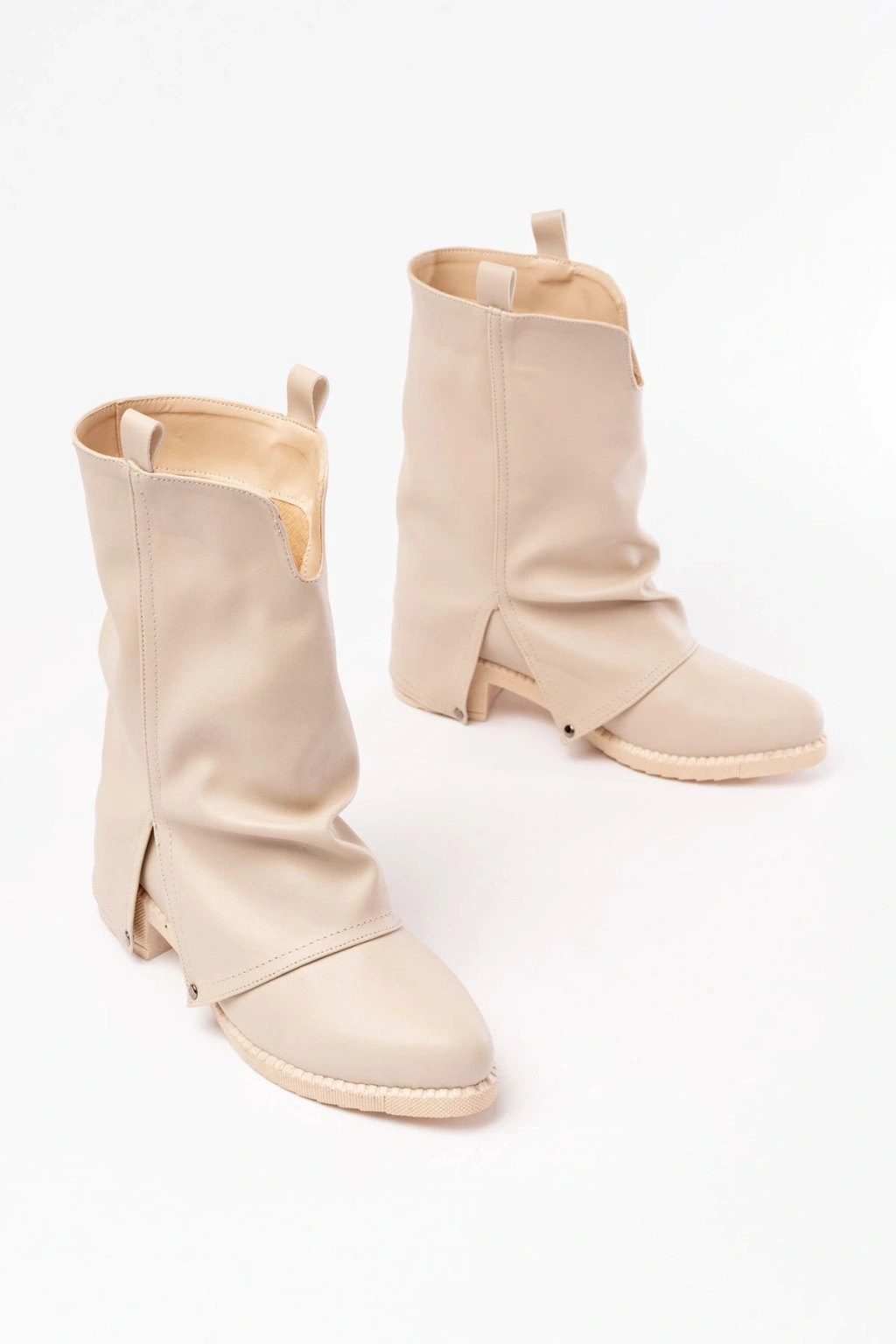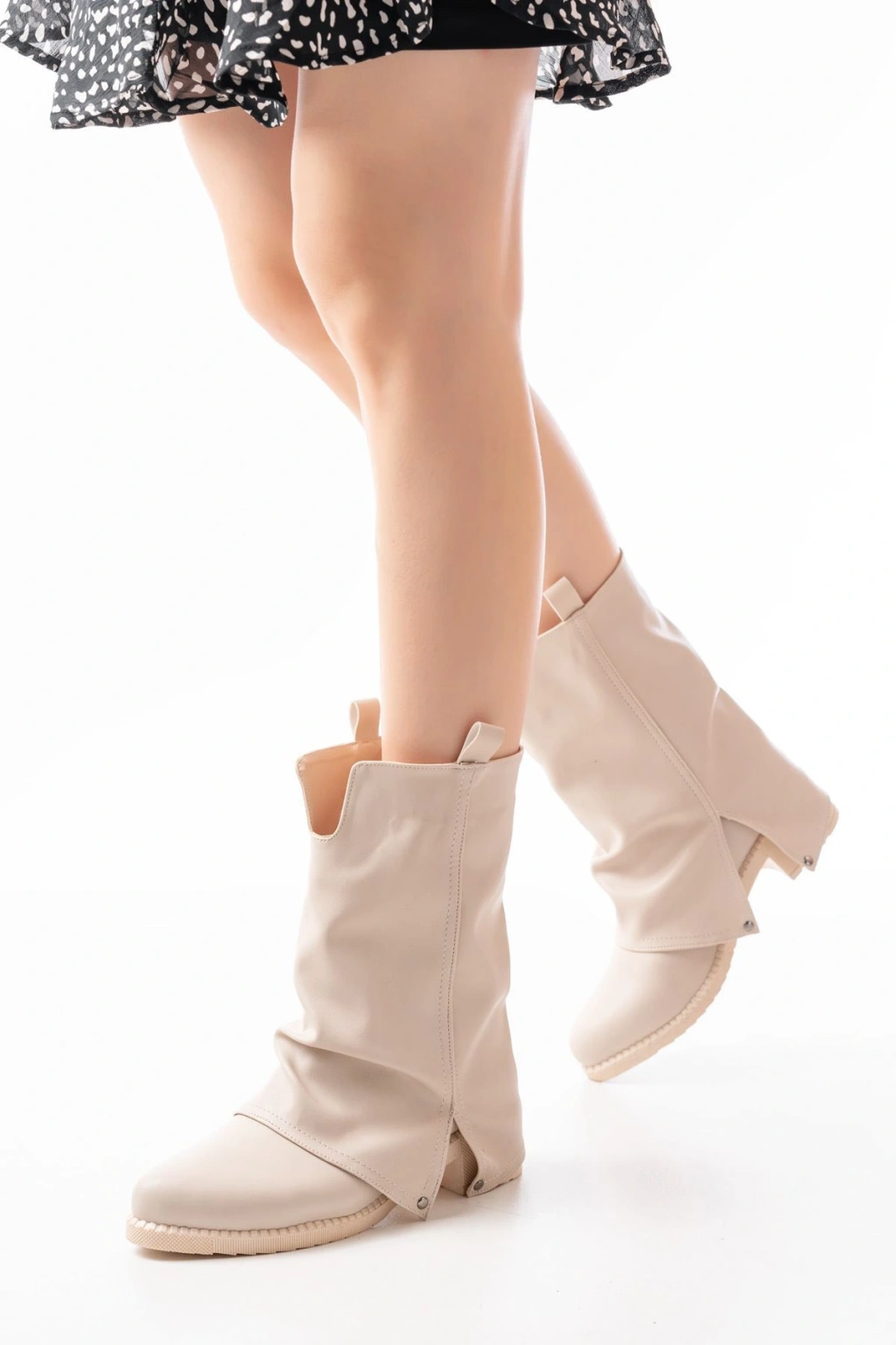 117 Bej Kovboy Dikiş Detaylı Fermuarlı Yüksek Topuklu Günlük Kadın Bot