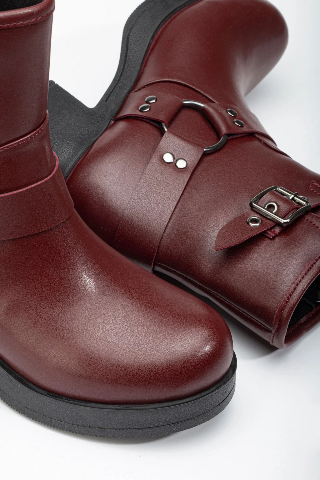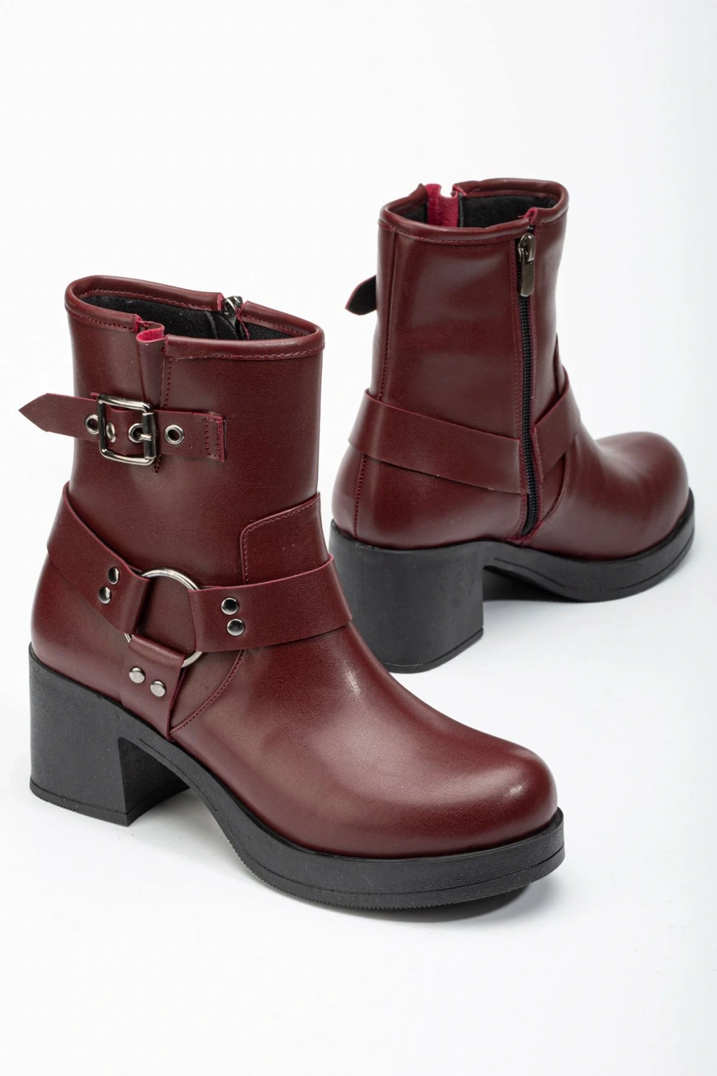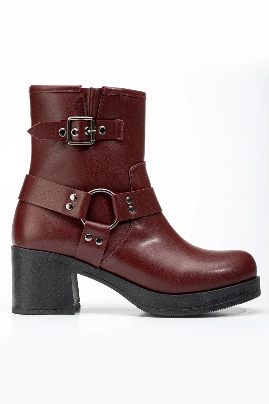 5109-3042 Bordo Toka Aksesuarlı Fermuarlı Kalın Topuklu Günlük Kadın Bot