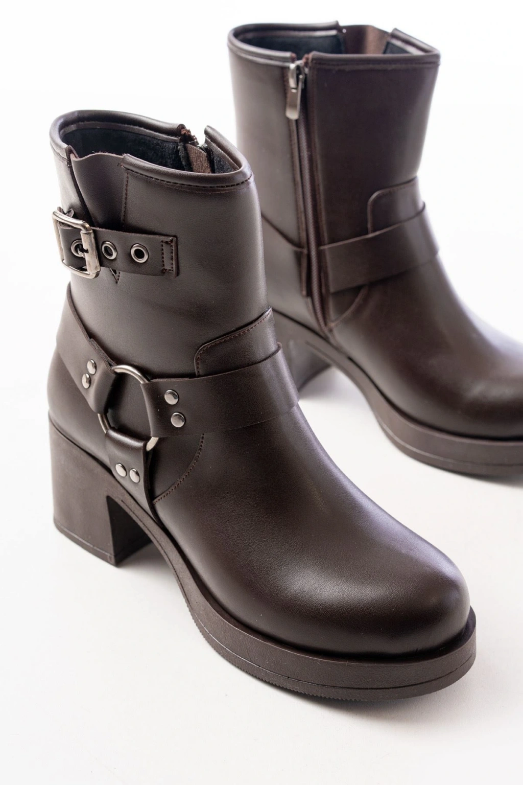 5109-3042 Kahverengi Toka Aksesuarlı Fermuarlı Kalın Topuklu Günlük Kadın Bot