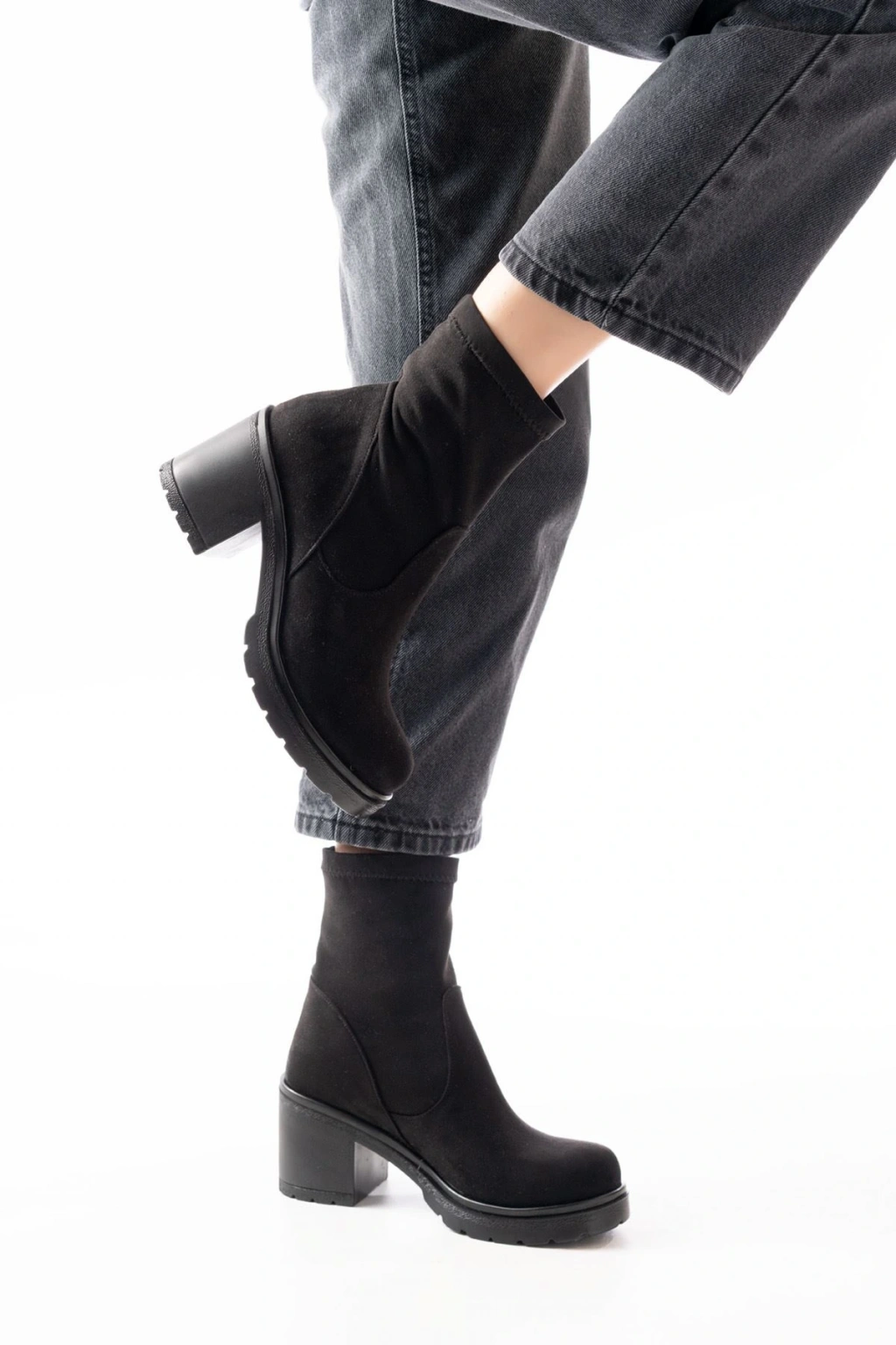 767-3040 Siyah Süet Günlük Kalın Topuklu Kadın Bot