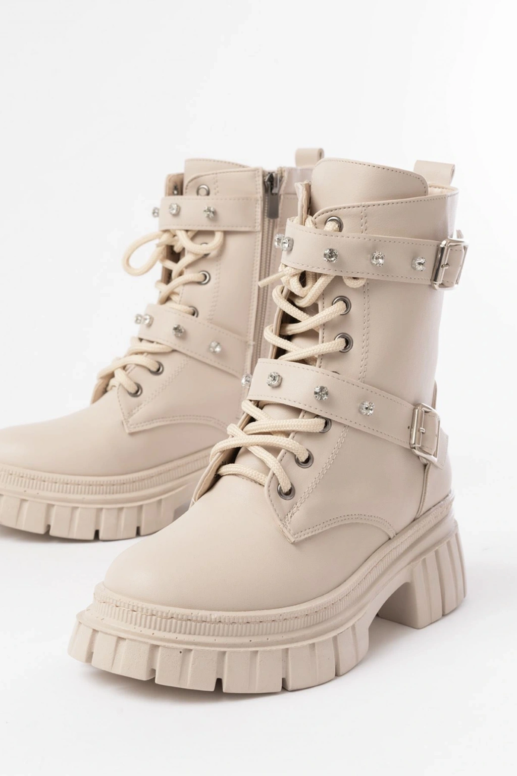842-03 Bej Bağcıklı Kalın Tabanlı Bağcıklı Fermuarlı Günlük Kadın Bot