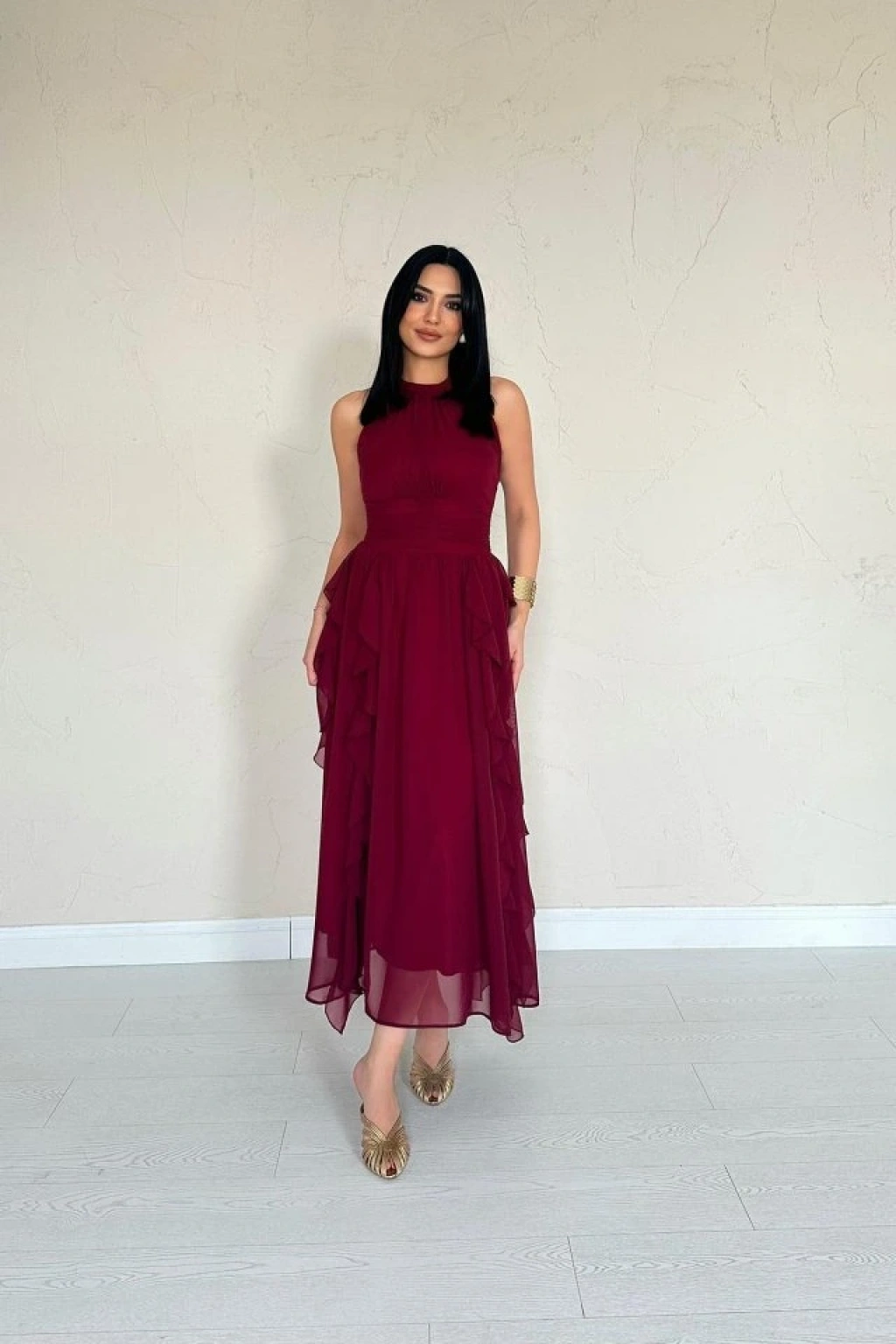 Bordo Önü Büzgülü Fırfırlı Elbise