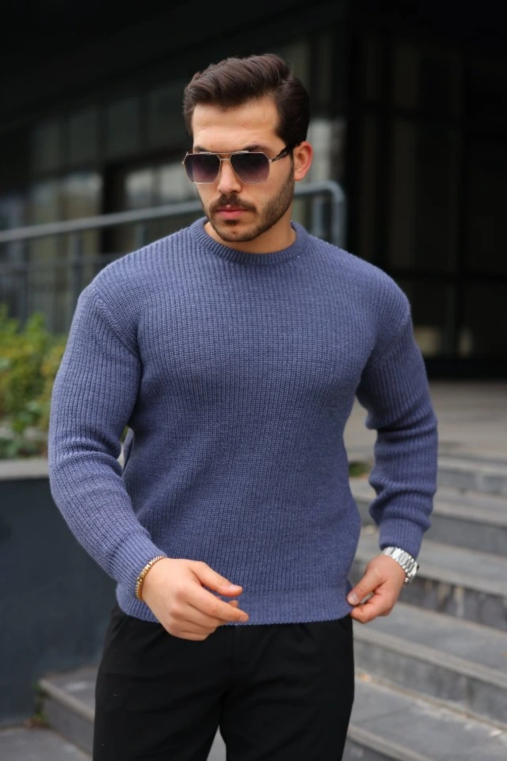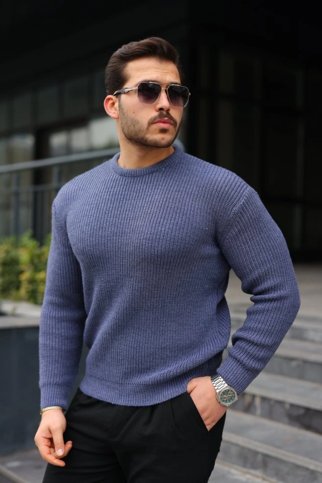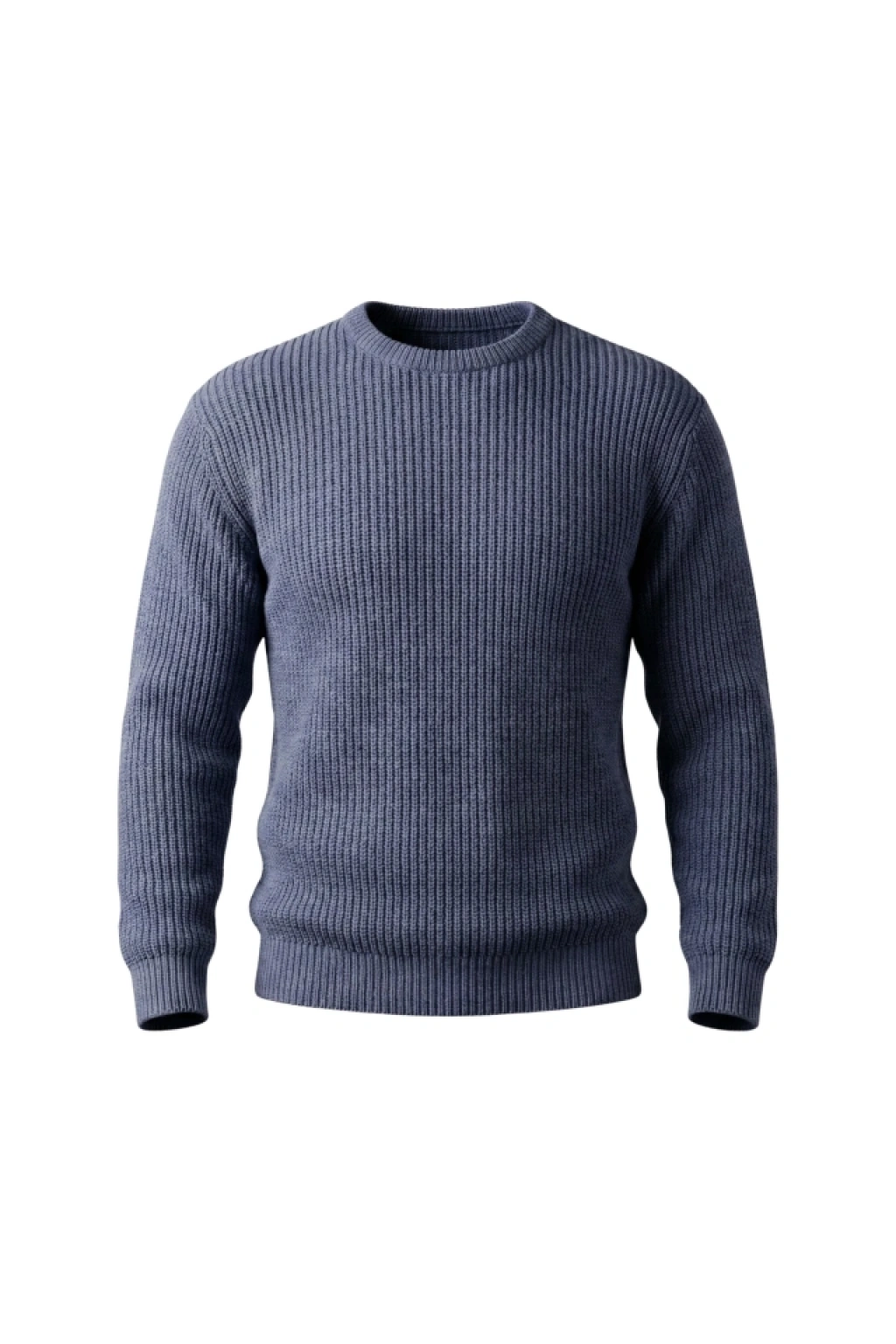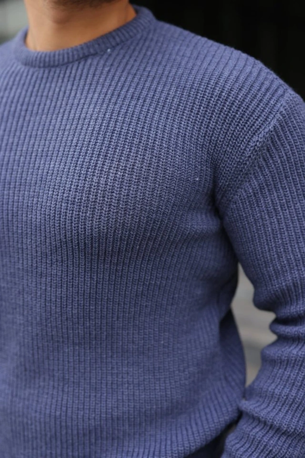 Erkek Balıkcı Yaka Bağazlı Triko Kazak Pamuklu Kalın Fitilli Dokuma, Regular Fit Uzun Kollu Kışlık odel İndigo