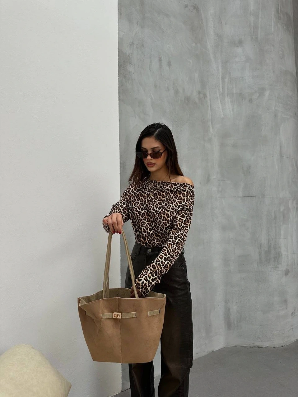 Kadın Leopar Desenli Düşük Omuzlu Bluz