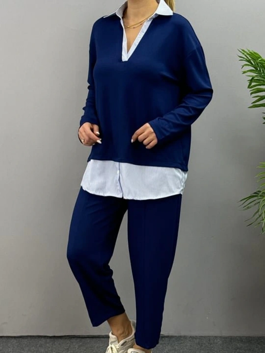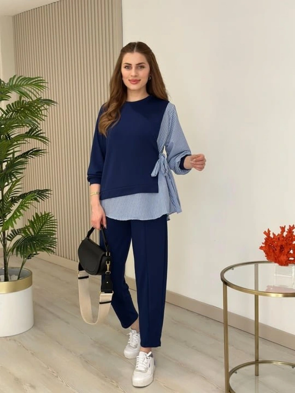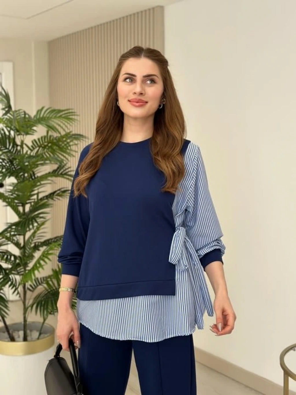 Kadın Gömlek Detay çizgili Yandan Bağlamalı Ikili Takım