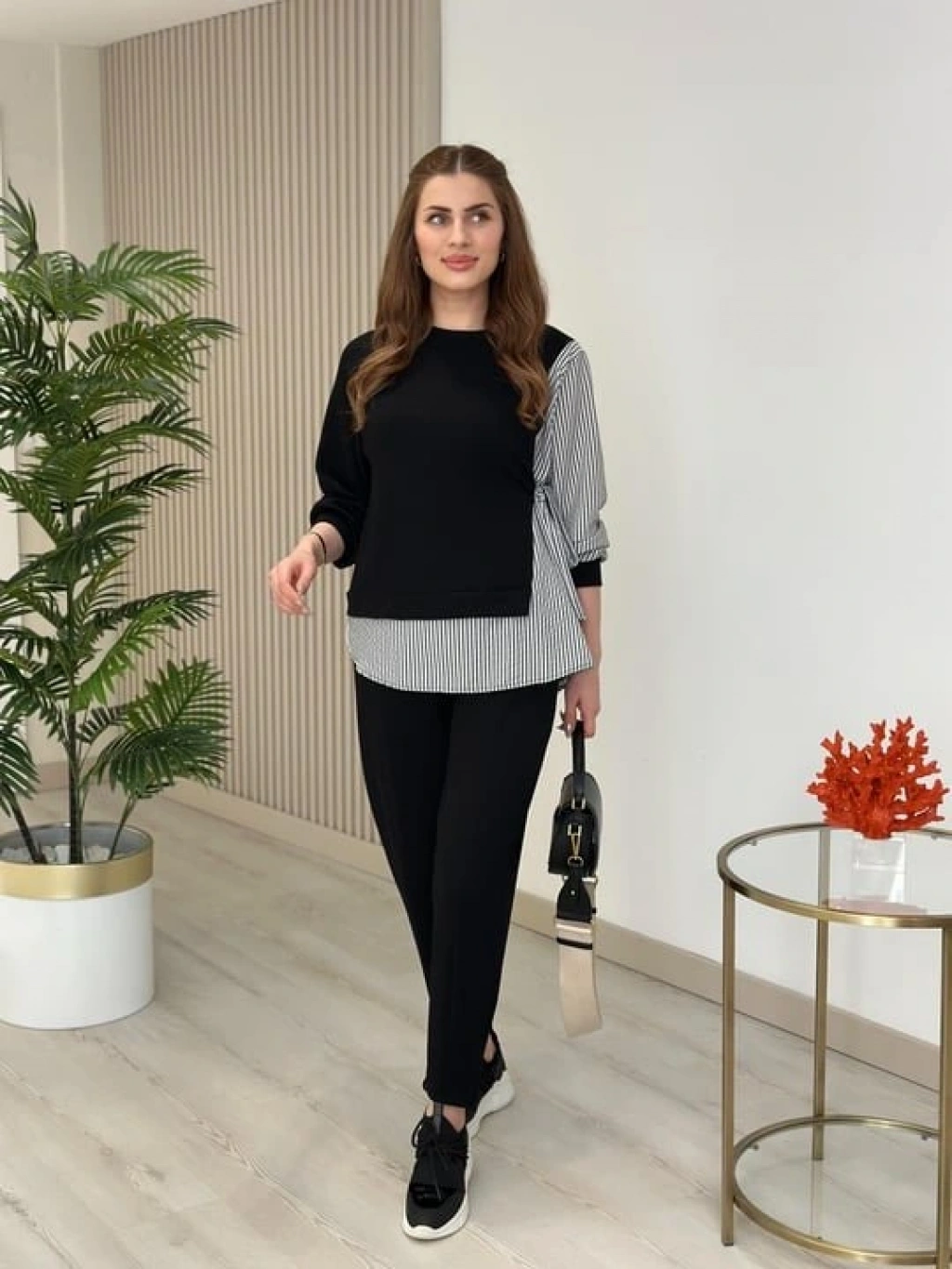 Kadın Gömlek Detay çizgili Yandan Bağlamalı Ikili Takım