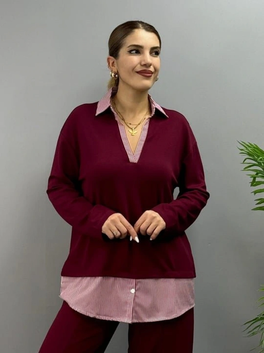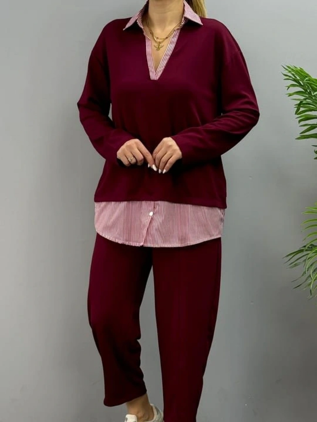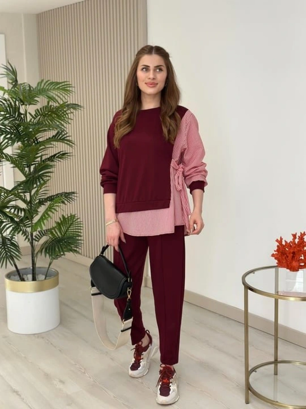 Kadın Gömlek Detay çizgili Yandan Bağlamalı Ikili Takım