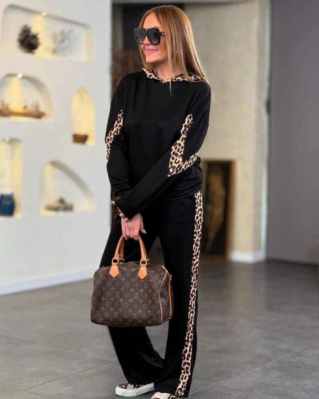 Kadın Kapüşonlu Leopar Detay Sweat Ve Yüksek Bel Yanları Leopar şeritli Bol Paça Pantolon Ikili Takım