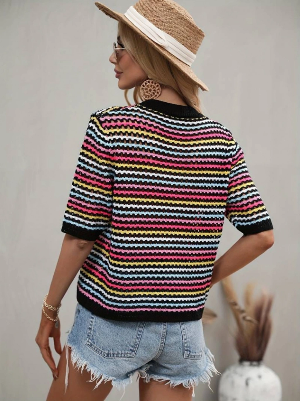 Kadın Kısa Kollu Bisiklet Yaka Renkli şerit Detaylı Triko Bluz