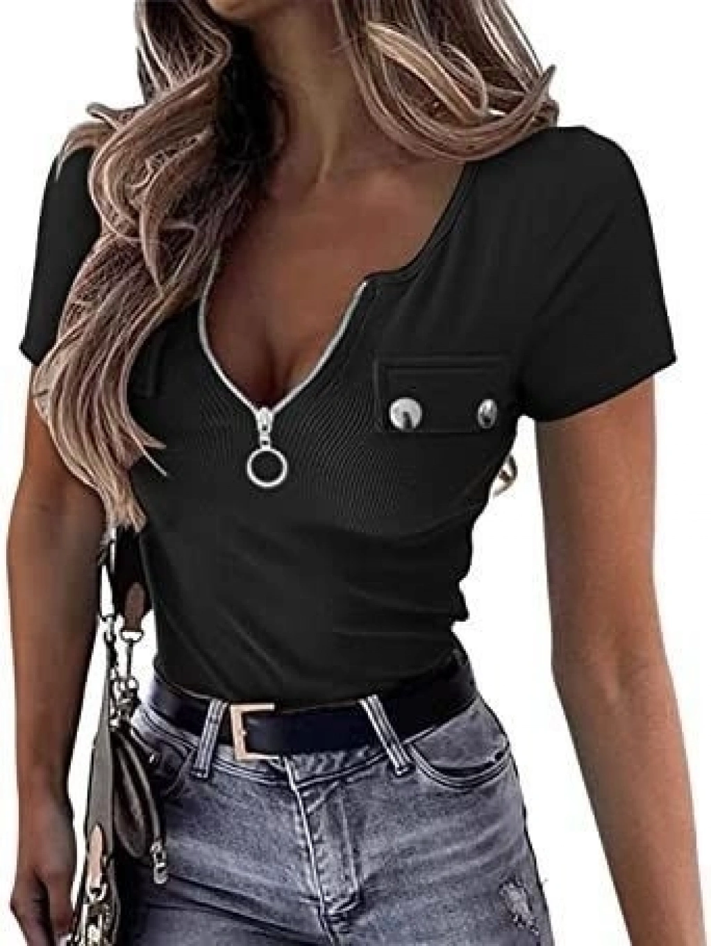Kadın Kısa Kollu Fermuarlı Cep Detay Kaşkorse Bluz