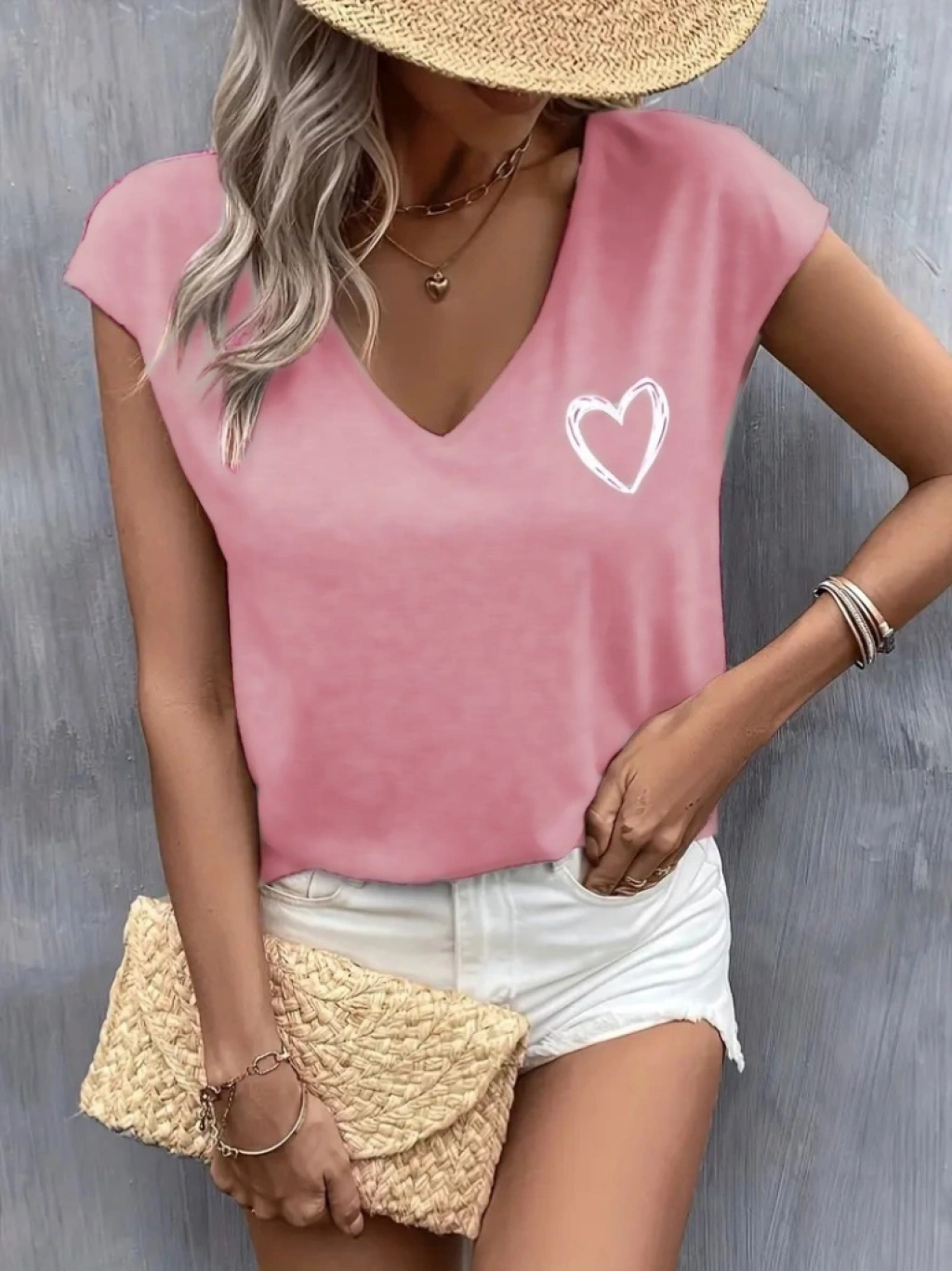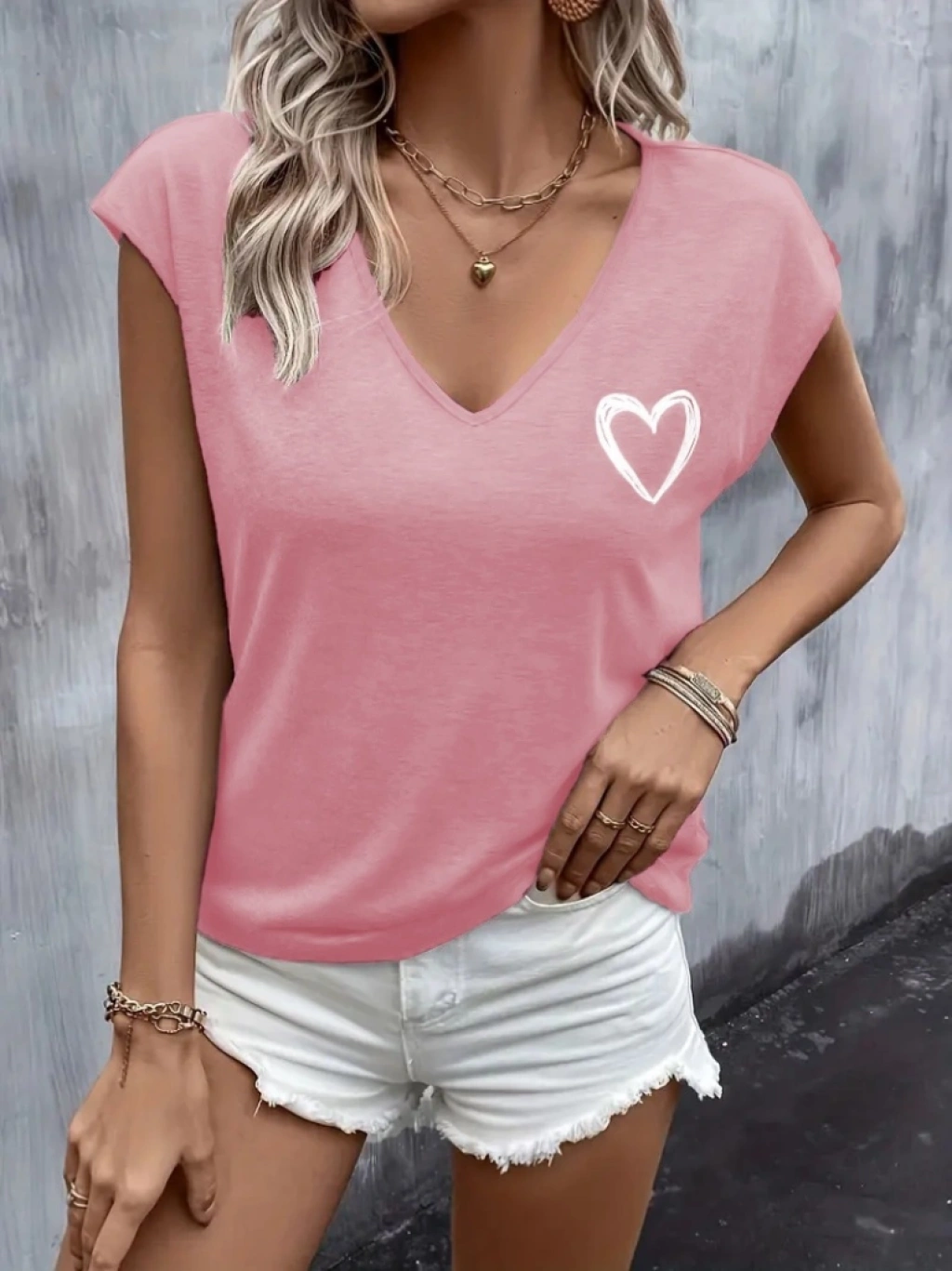Kadın Kısa Kollu V Yakalı Kalp Baskılı Viskon Bluz