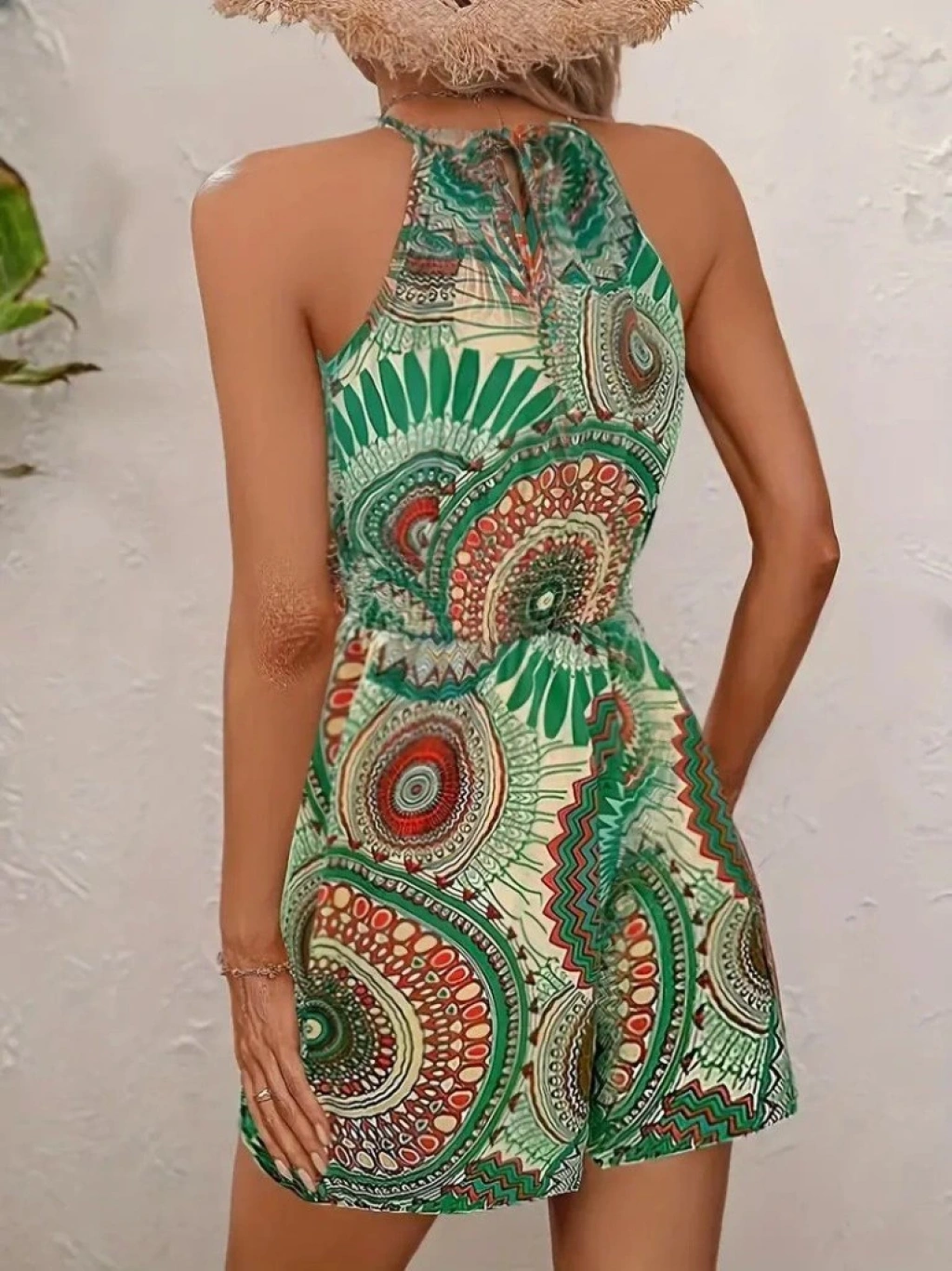 Kadın Omuzlardan Açık Boyun Arkasından Bağlamalı Beli Lastikli Desenli Süprem Kısa Tulum