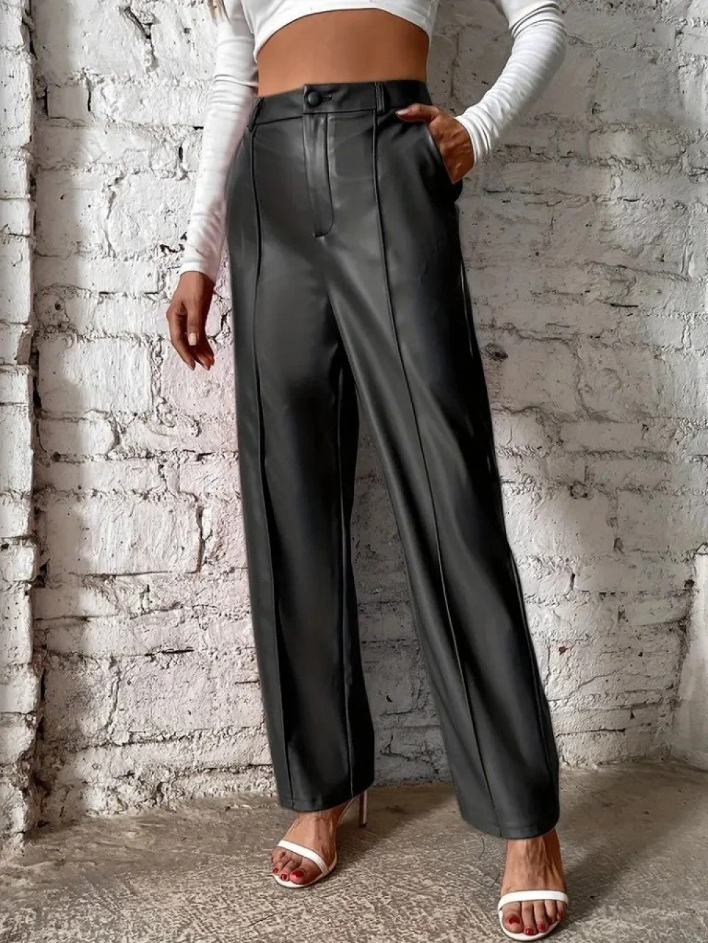 Kadın önden Fermuarlı Cepli Geniş Kesim Lame Deri Pantolon