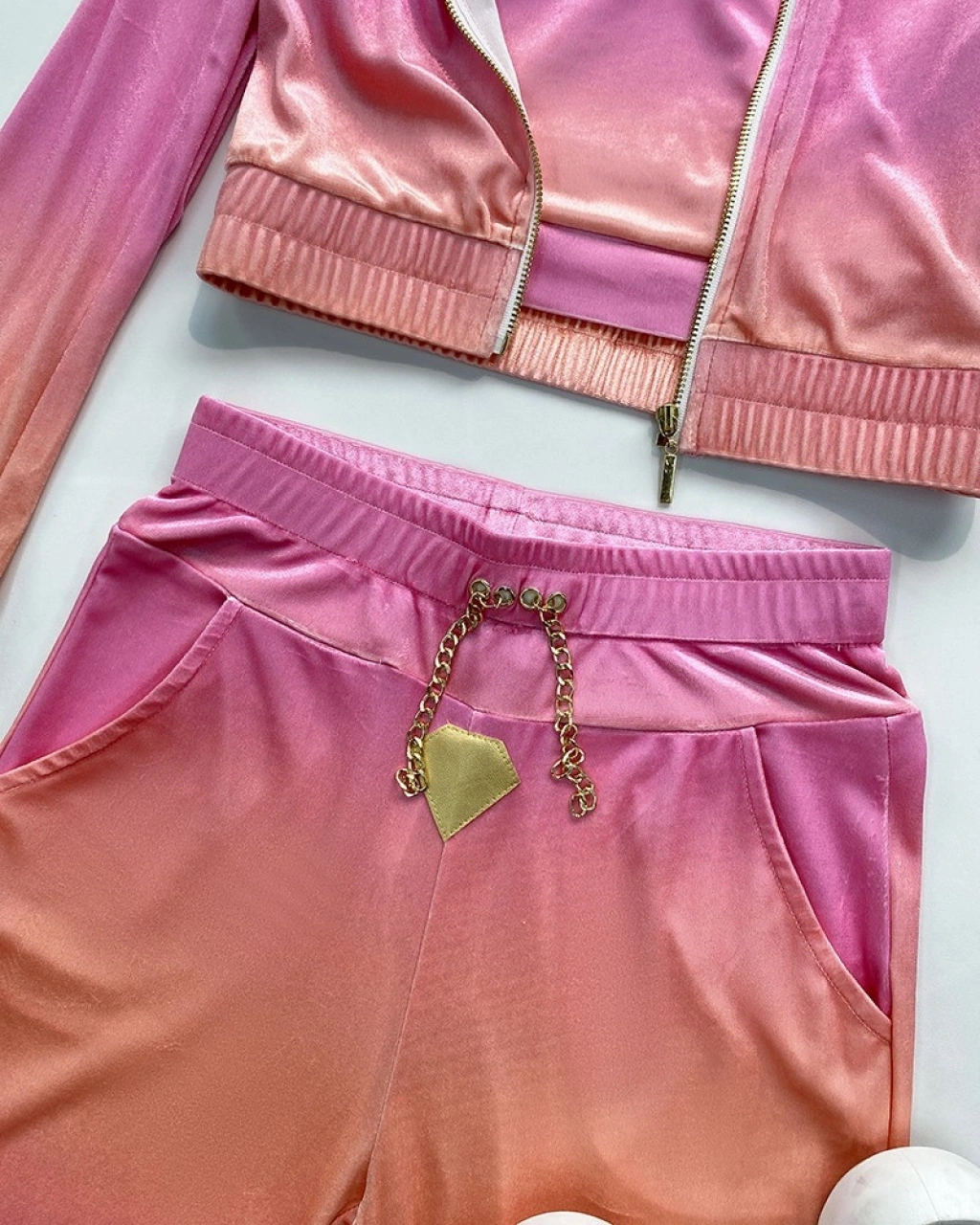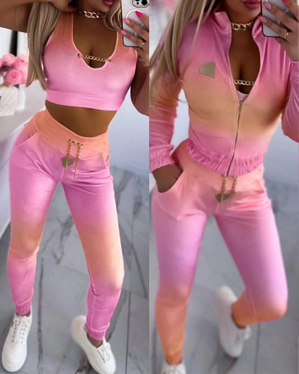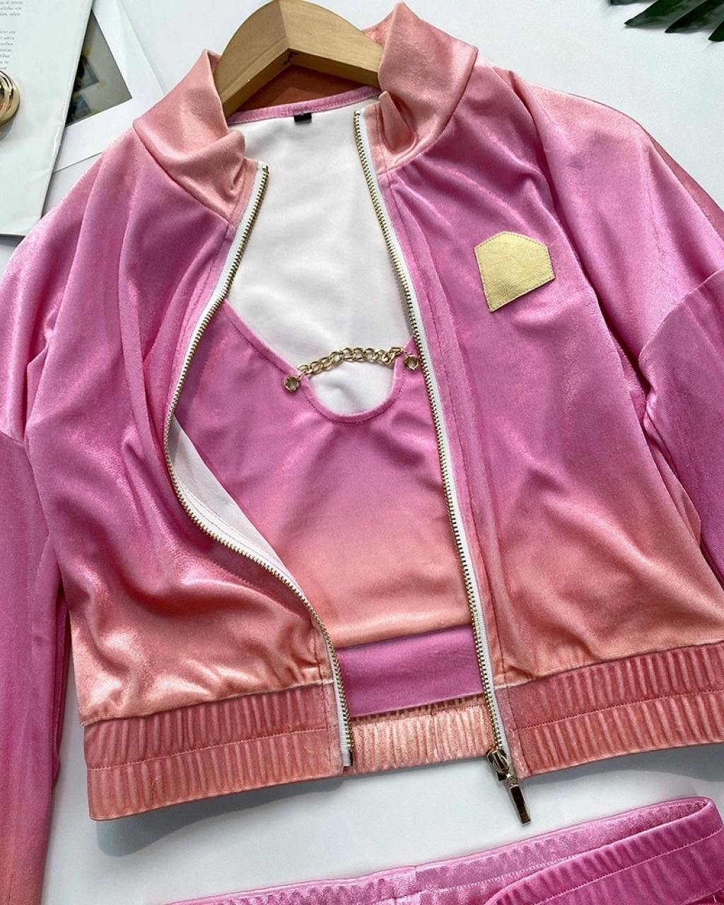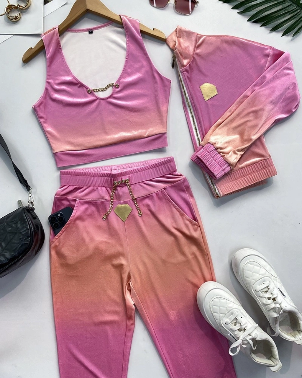Kadın Uzun Kollu Askılı Yuvarlak Yakalı Krop Bluz, Uzun Kollu önden Fermuarlı Ceket Ve Pantolon Dalgıç üçlü Takım