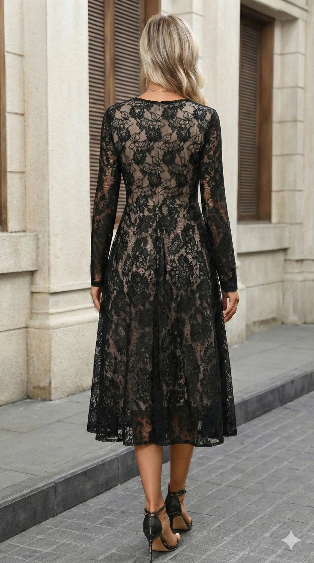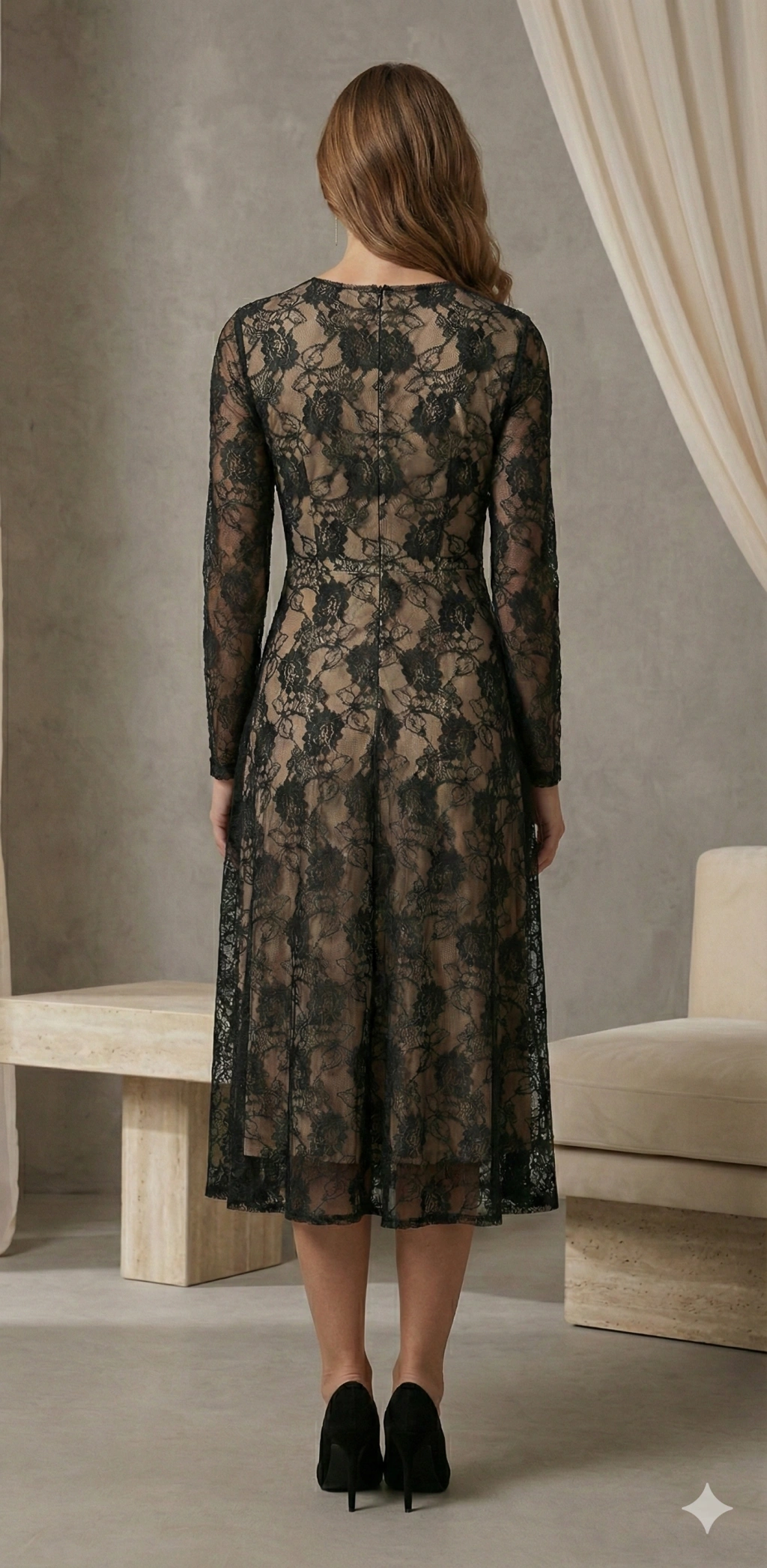 Kadın Uzun Kollu Bisiklet Yaka Dantelli Astarlı Midi Elbise