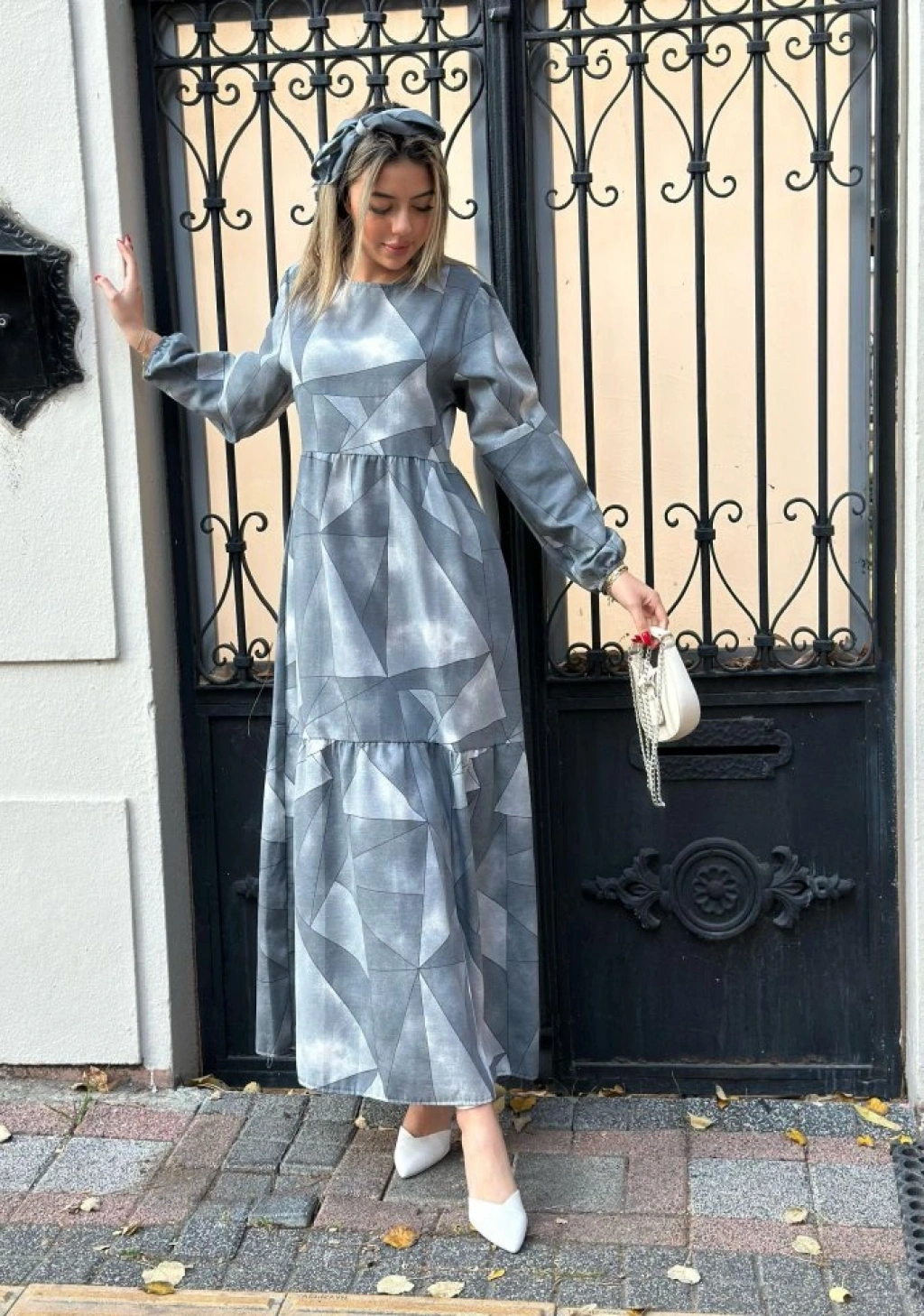 Kadın Uzun Kollu Bisiklet Yaka Geometrik Desen Baskılı Kuşak Dahil Maxi Boy Elbise