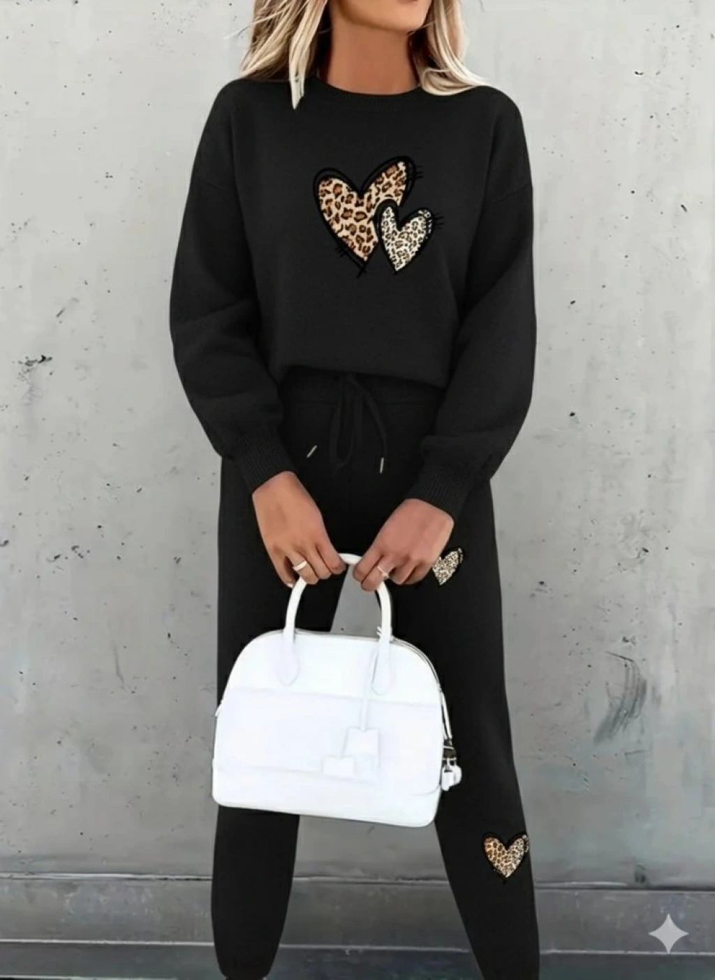 Kadın Uzun Kollu Bisiklet Yaka Kalp Desenli şardonlu üç Iplik Bluz Ve Pantolon Ikili Takım