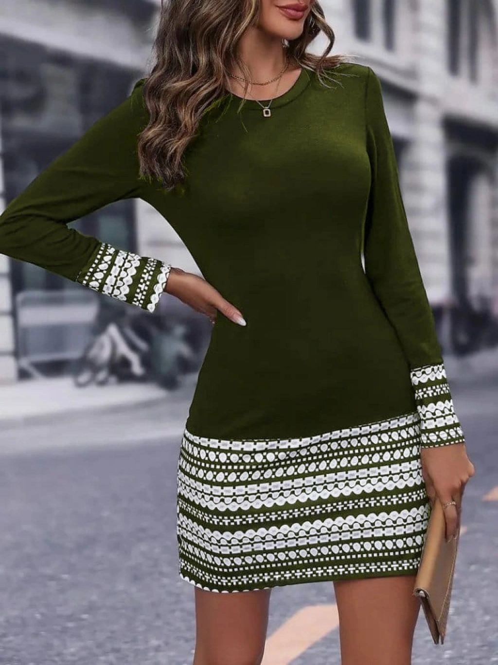Kadın Uzun Kollu Bisiklet Yaka Kol Ağzı Ve Etek Ucu Baskılı Iki Iplik Elbise