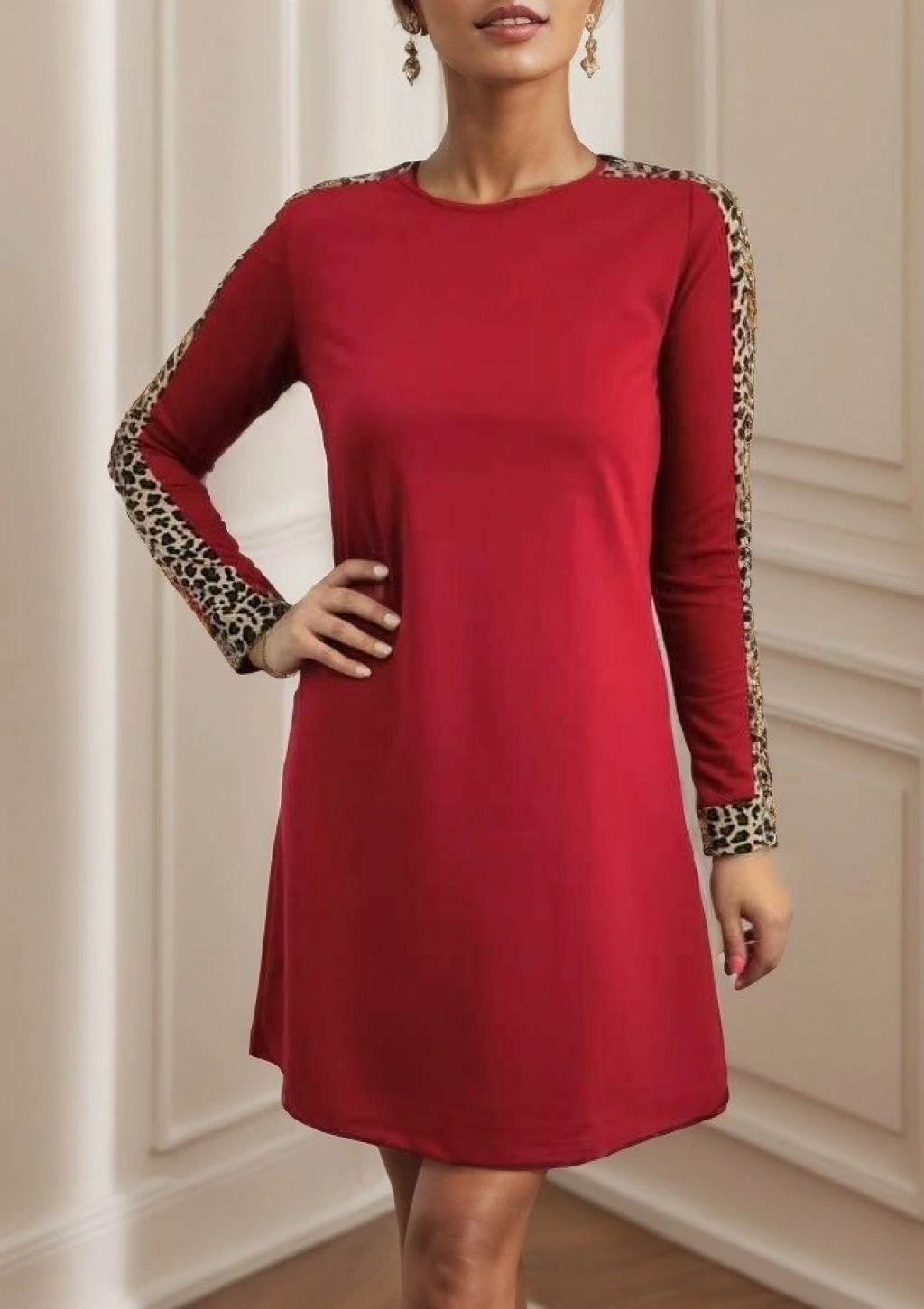 Kadın Uzun Kollu Bisiklet Yaka Kollar Leopar Detay Iki Iplik Mini Boy Elbise