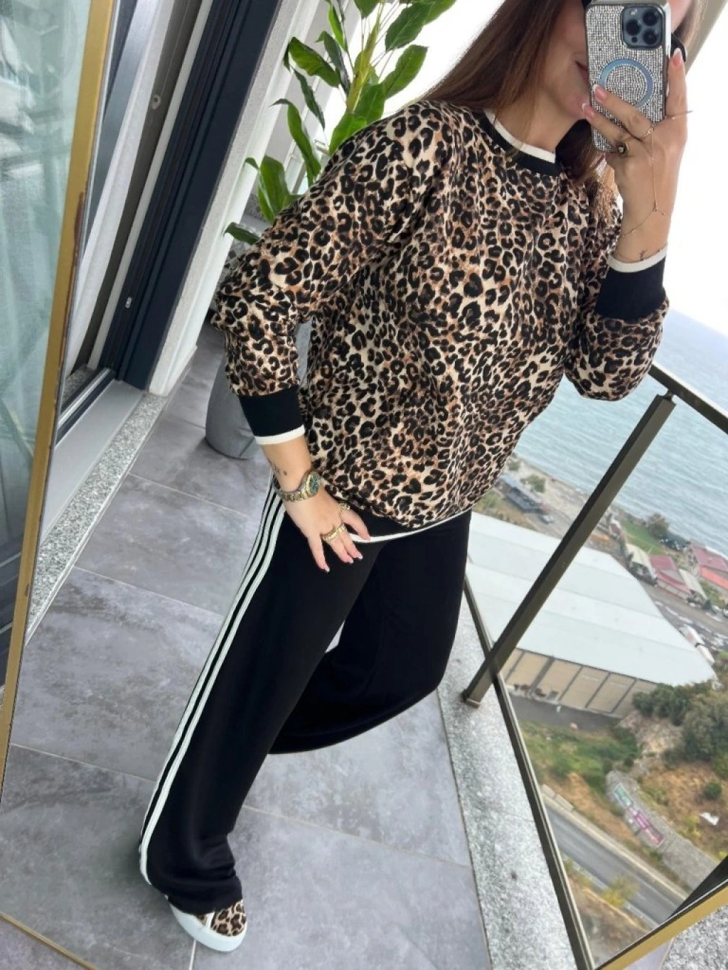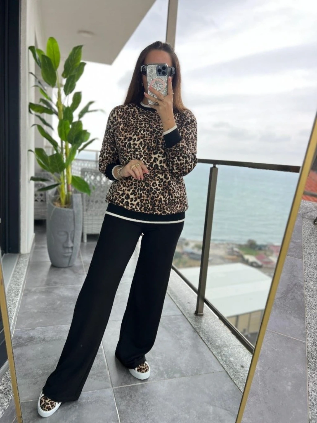 Kadın Uzun Kollu Bisiklet Yaka Leopar Desenli Iki Iplik Bluz Ve Viskon Iki Iplik Pantolon Ikili Takım