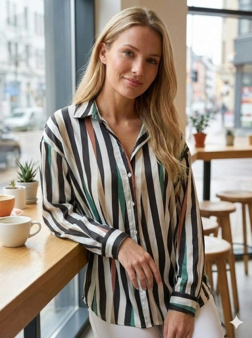 Kadın Uzun Kollu Dalgalı Desen Baskılı Gömlek