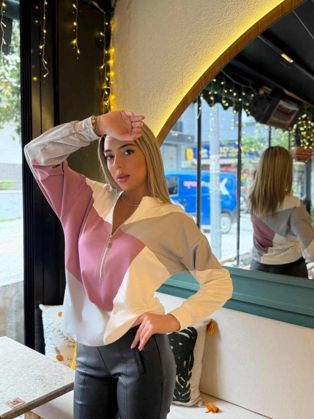 Kadın Uzun Kollu önden Fermuar Detaylı Desenli şardonlu Dalgıç Bluz