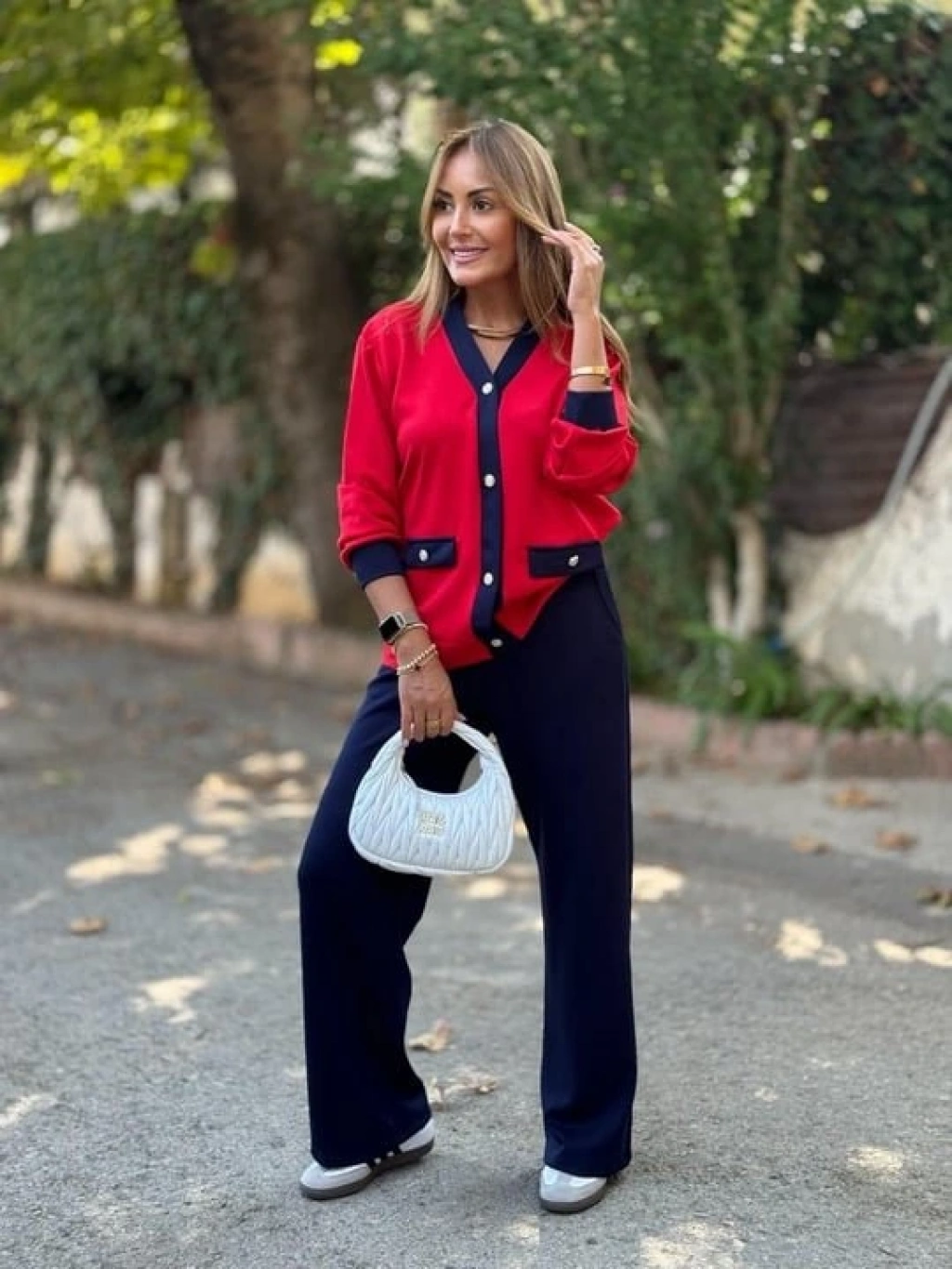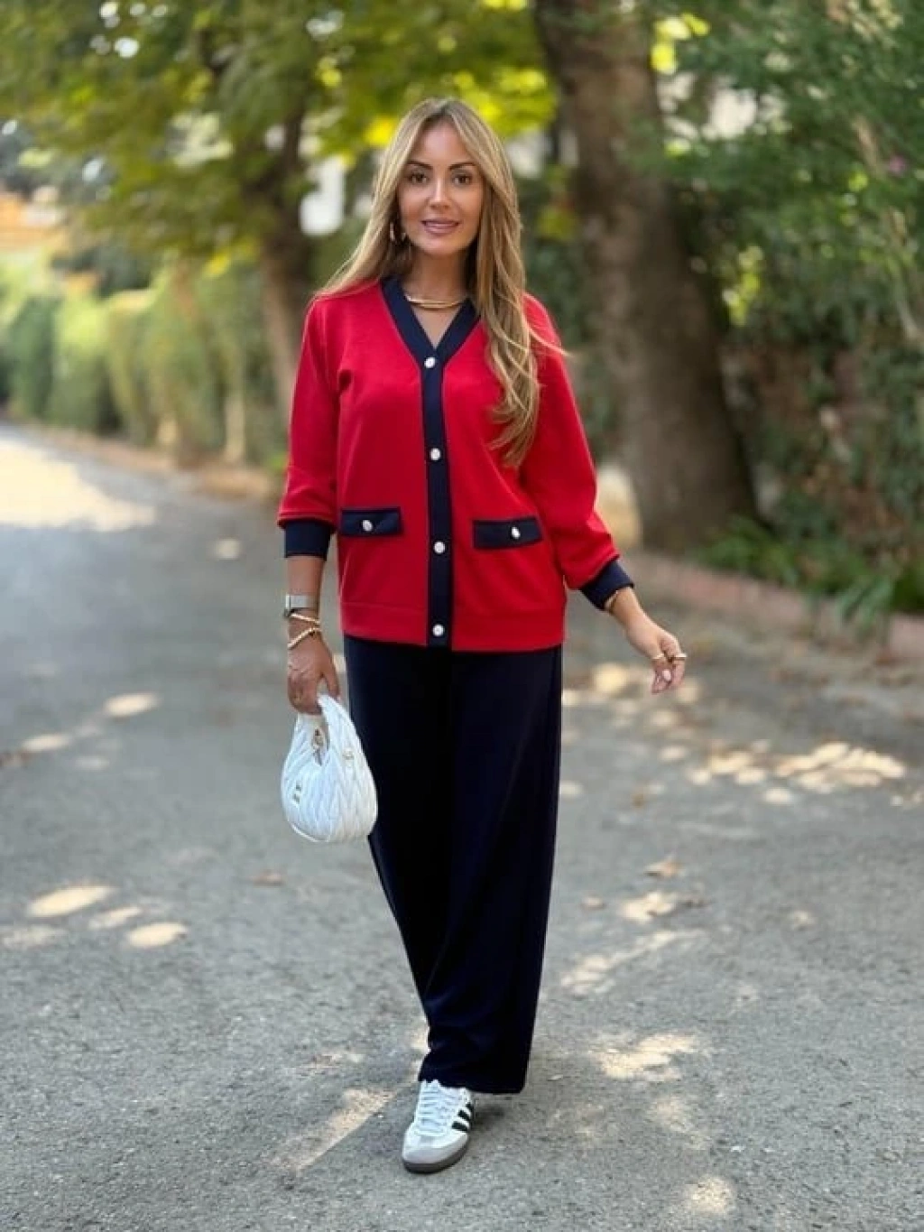 Kadın Uzun Kollu Ribanali Cep Detay Hırka Ve Bol Paça Pantolon Ikili Takım
