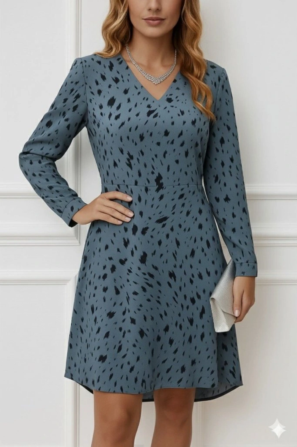 Kadın Uzun Kollu V Yakalı Desenli Kısa Keten Elbise