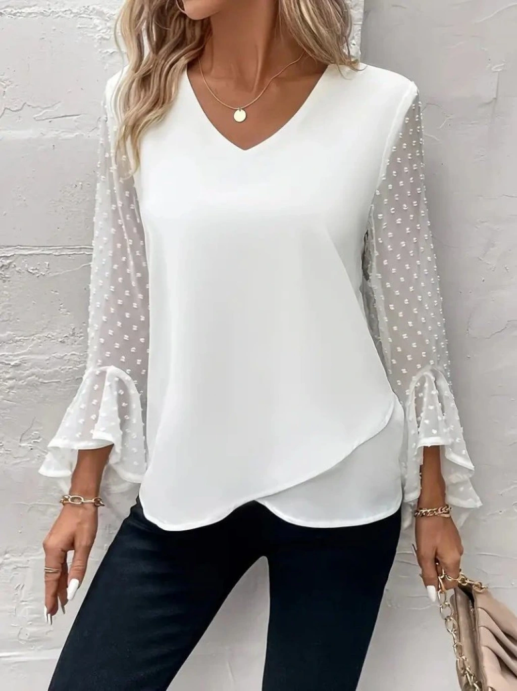 Kadın Uzun Kollu V Yakalı Kolları Ispanyol Detayı Sandy Bluz