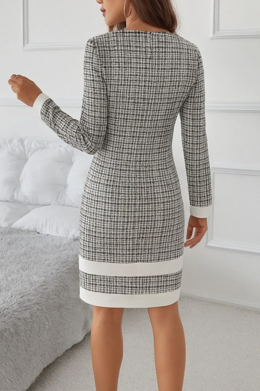 Kadın Uzun Kollu Yuvarlak Yaka Etek Ucu şerit Detaylı Mini Dokuma Elbise