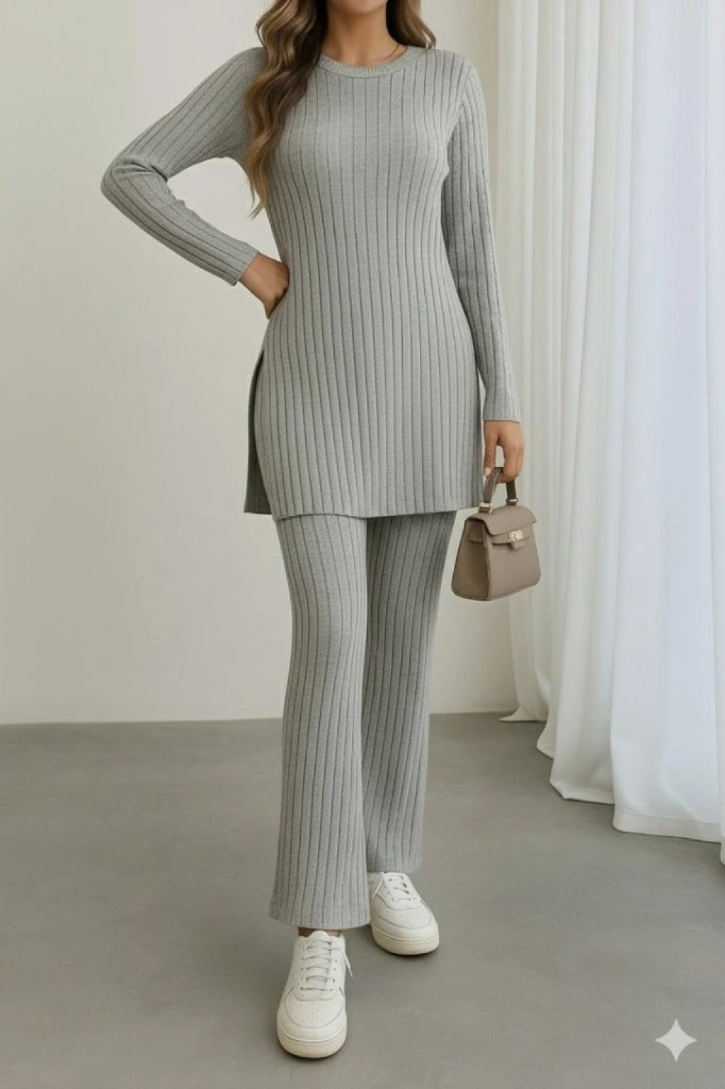 Kadın Uzun Kollu Yuvarlak Yaka Yandan Yırtmaç Detaylı şardonlu Kaşkorse Bluz Ve Pantolon Ikili Takım