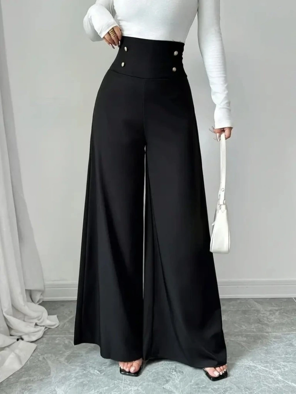 Kadın Yüksek Bel Düğmeli Geniş Paçalı Ithal Krep Pantolon