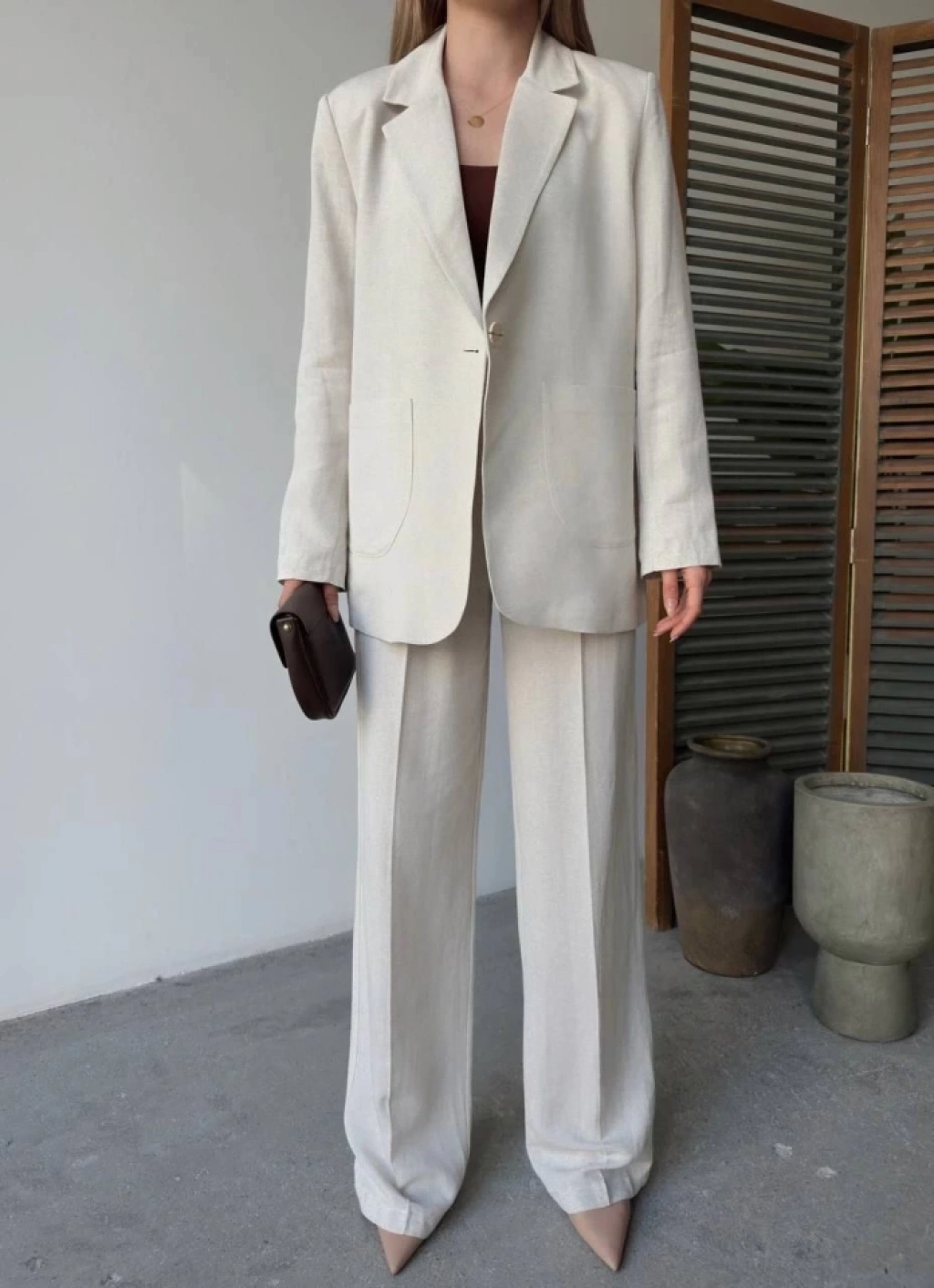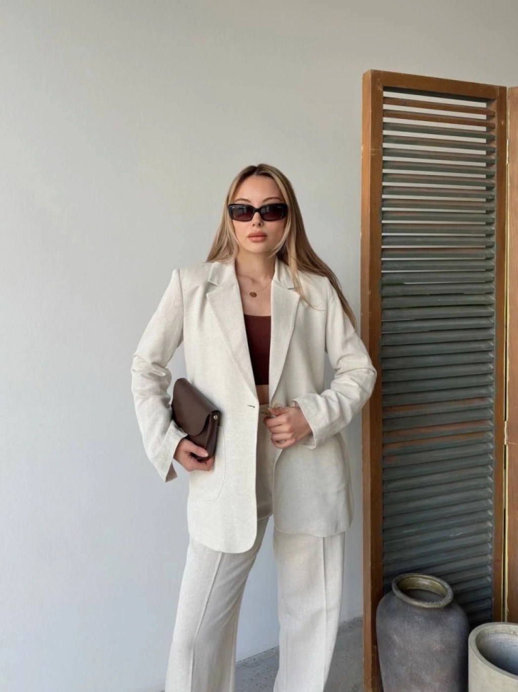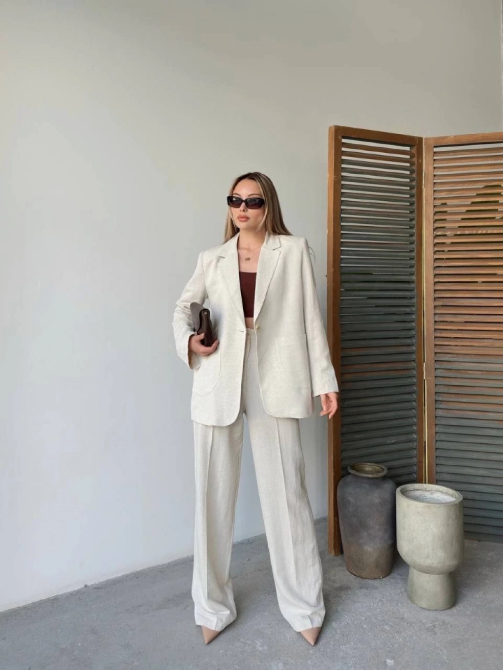 Keten Ceket Pantolon Ikili Takım - Beyaz