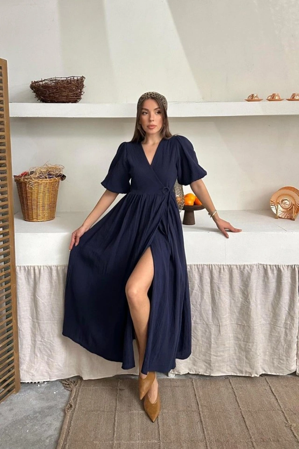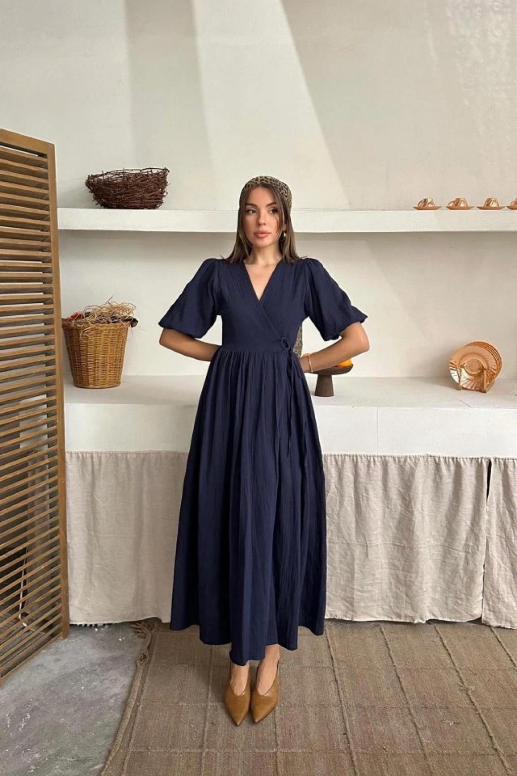 Lacivert Müslin Uzun Elbise