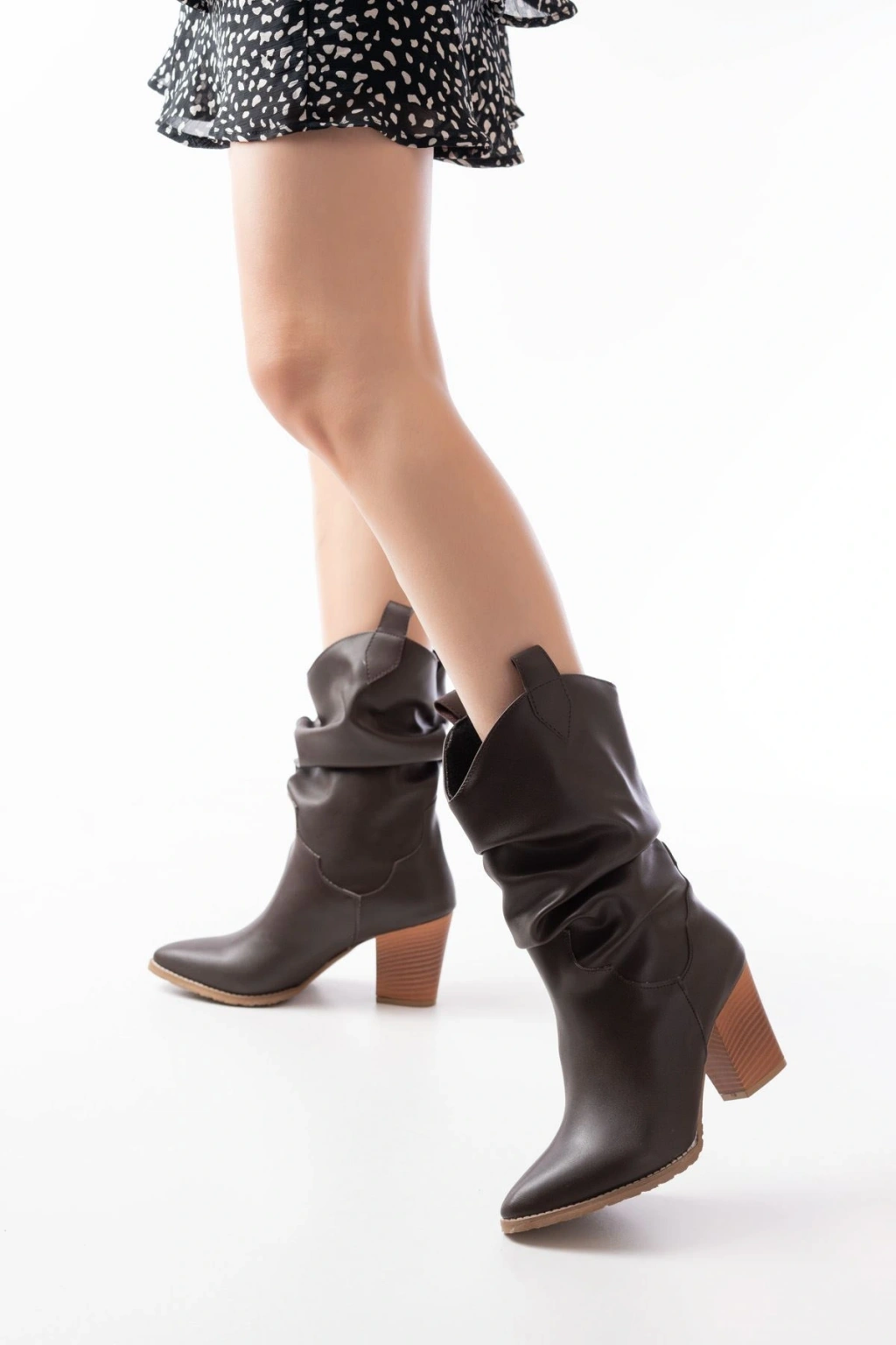 117 Kahve Kovboy Dikiş Detaylı Fermuarlı Yüksek Topuklu Günlük Kadın Bot