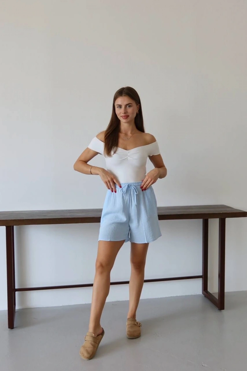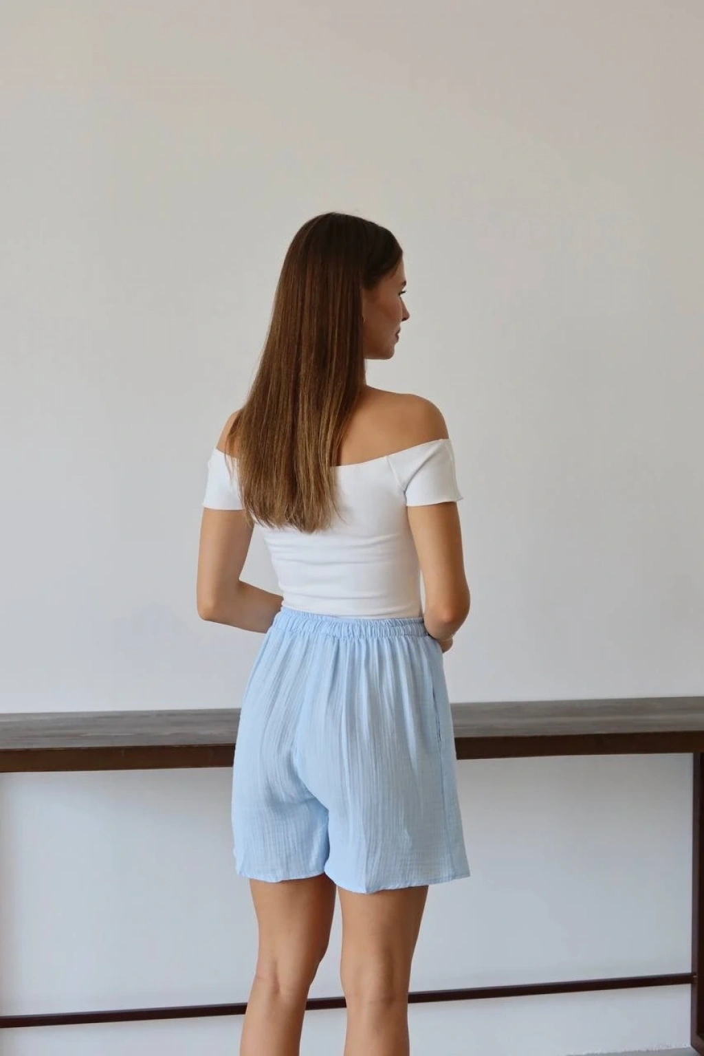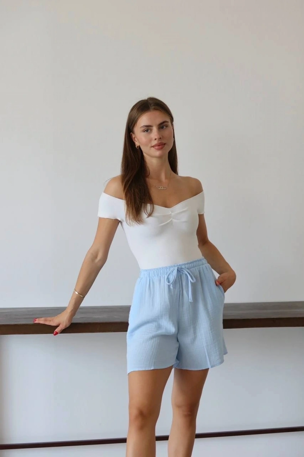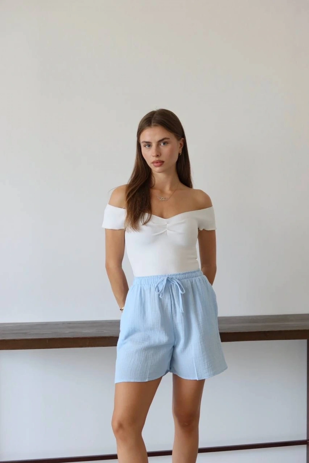 Bu mavi şort, yaz aylarında rahat ve şık bir seçenektir. Bağcıklı tasarımı sayesinde bel kısmını istediğiniz şekilde ayarlayabilirsiniz. Yüksek kaliteli müslin kumaştan üretilmiştir ve cilt dostudur. Hem günlük kullanıma hem de plaj günlerine uygun bir parçadır.