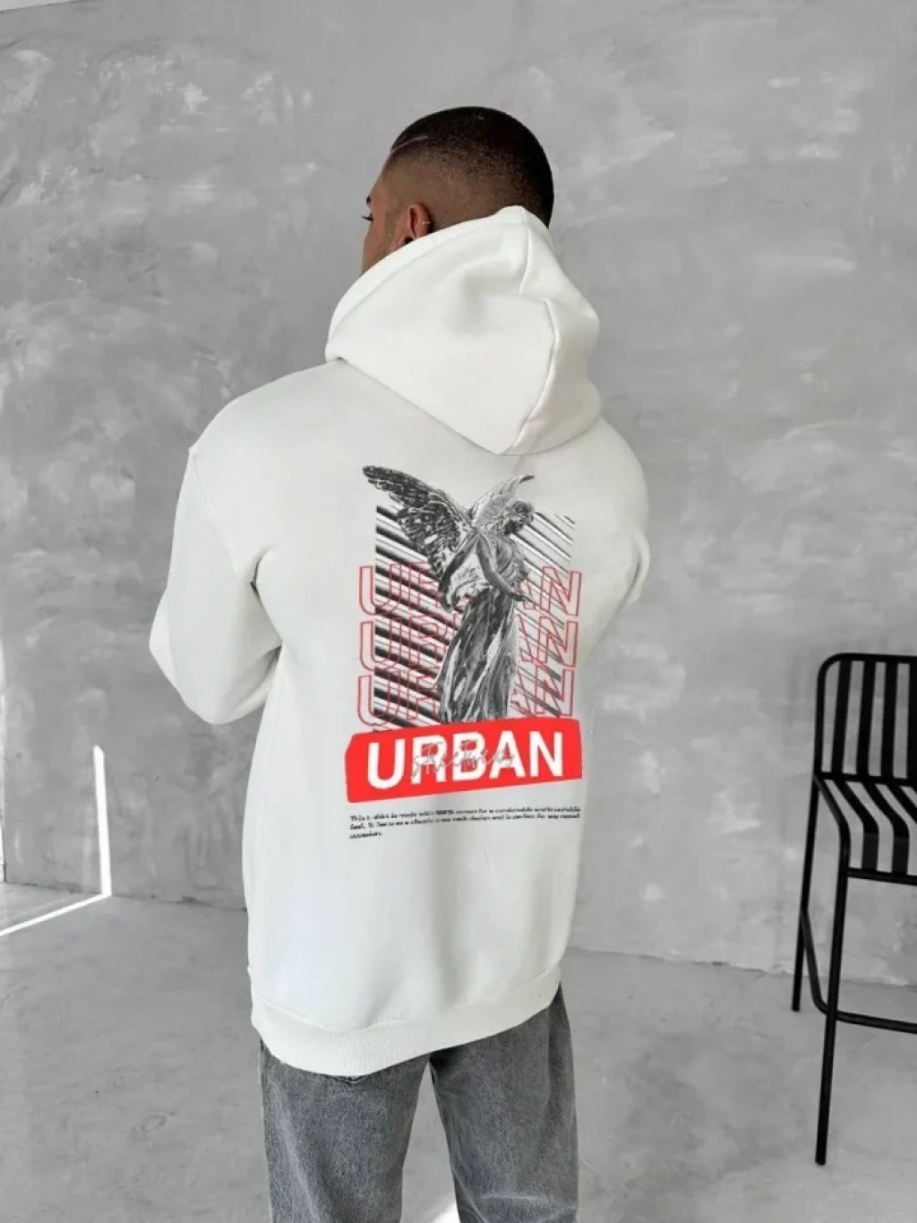 Erkek Şeritli Kapüşonlu weatshirt Oversize 3 Iplik Pamuklu Beyaz