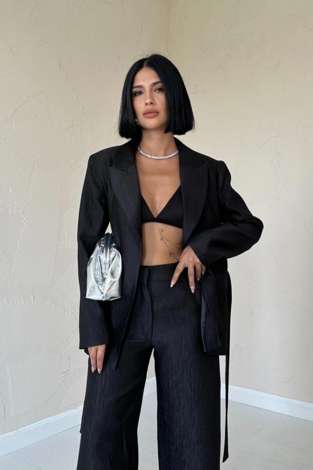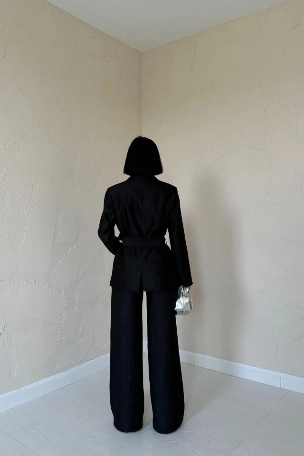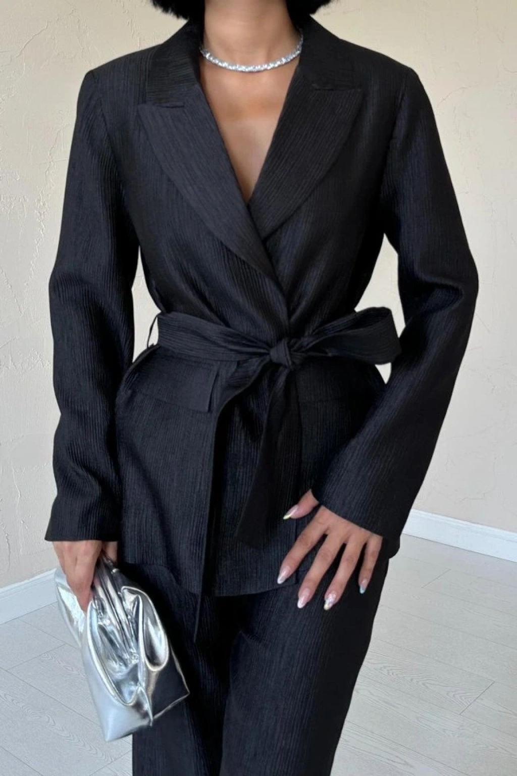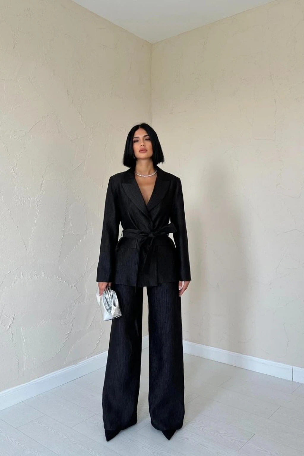 Siyah Beli Kuşaklı Ceket Ve Pantolon Parlak Takım