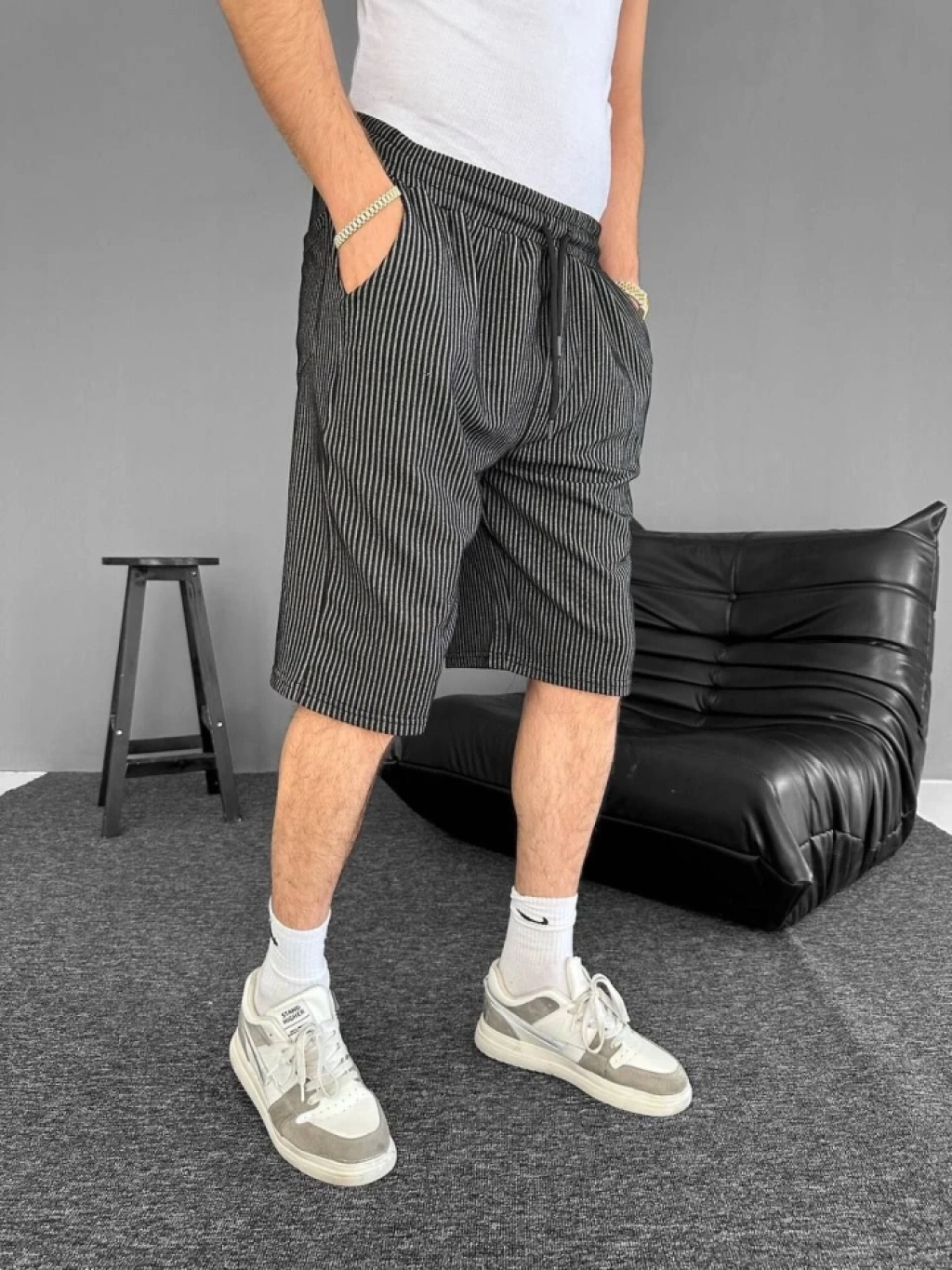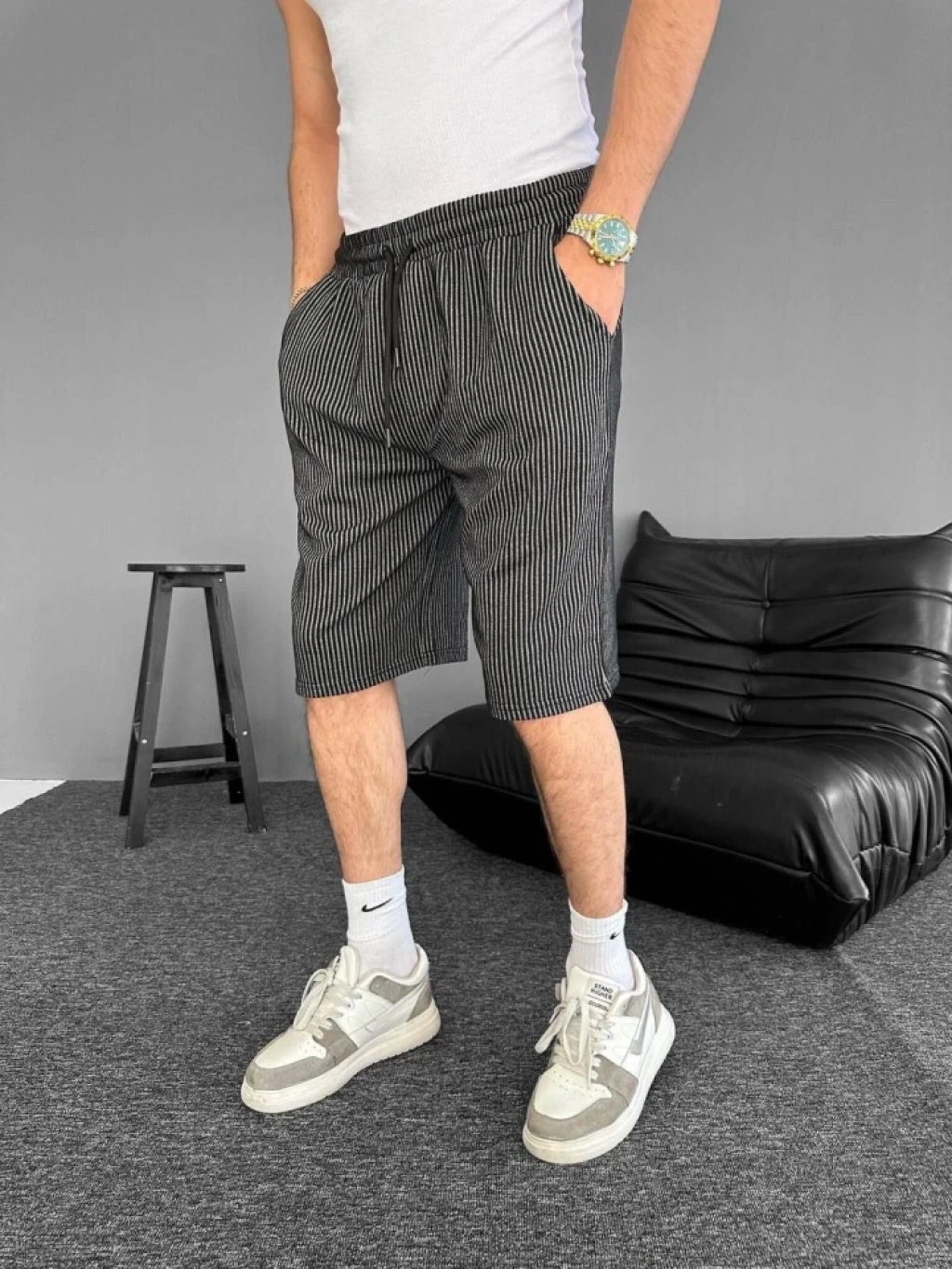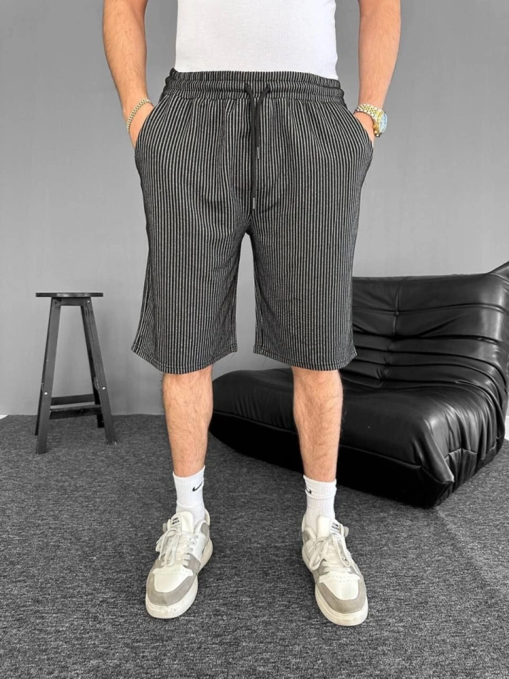 u Yolu Çizgili Cepli Şort iyah