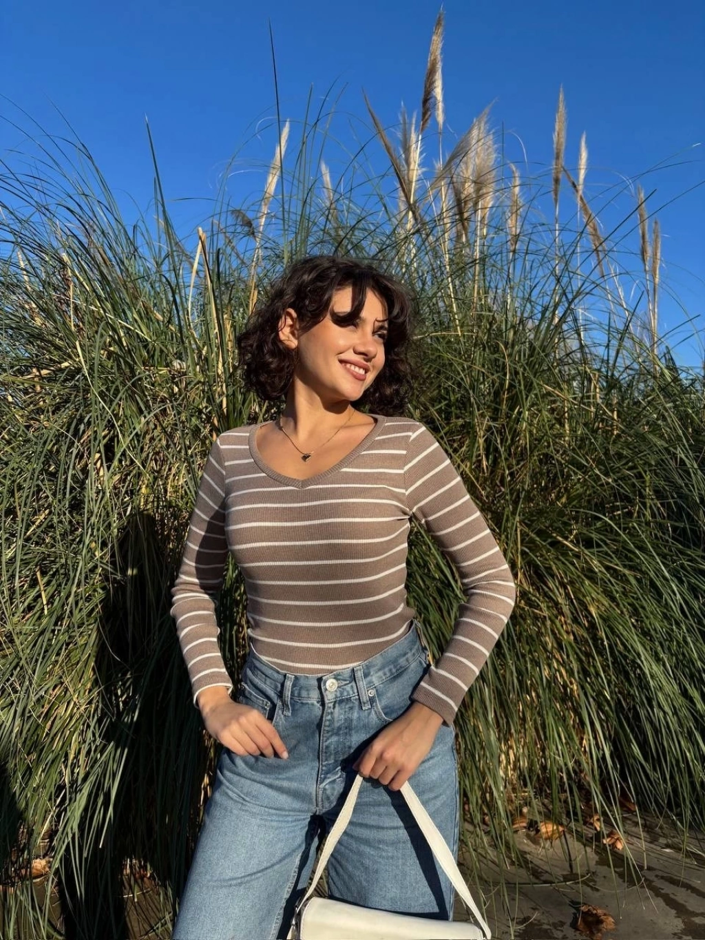 - Bej renk ve çizgili desen kombinasyonu, şıklık ve zarafeti bir arada sunar.